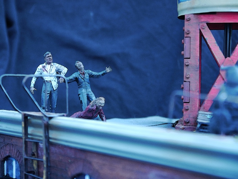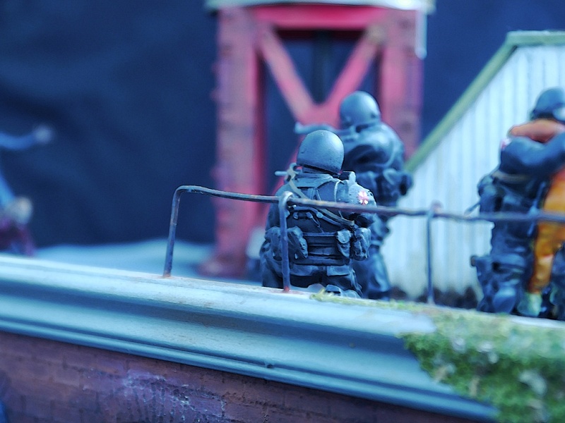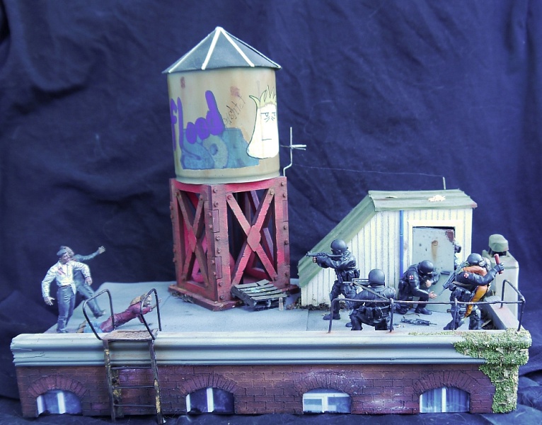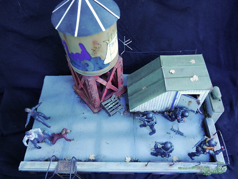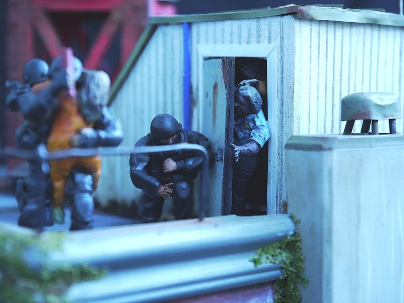 | "Уже несколько лет миновало с той ужасной трагедии, произошедшей в тихом пригороде США. Трагедии, которая потрясла весь мир. Но даже в такой ситуации нашлись те, кто решил паразитировать на общем горе. Те, кто пытался добиться дешевой популярности или каких-то еще своих низких целей, раскрывая общественности якобы факты той трагедии. Что якобы во всем была виновата одна крупная мировая фармацевтическая компания, которая, спешим напомнить нашим дорогим читателям, между прочим понесла серьезные убытки оказывая безвозмездную помощь всем пострадавшим, а так-же продолжая оказывать дальнейшее содействие и всю возможную помощь государственным структурам, занимающимся ликвидацией последствий катастрофы. Апофеозом нелепости распускаемых лживых слухов стала недавняя информация о том, что эта корпорация секретно отправляла в зараженный город свой специальный отряд с целью вывезти из него некий объект. Что это был за объект, и откуда поступила такая информация естественно не сообщается. Официальный представитель фармацевтического гиганта прокомментировал это лишь тем, что - цитируем "Ведется очень грязный бизнес. И наши конкуренты готовы пойти на что угодно, лишь-бы очернить наше честное имя."" По работе - основание, это деревянный брусок. Кирпичики и окна вырезаны на его краях. Бочка из пластиковой бутылки. Остальное - пвх, картон, прозрачный пластик. Фигурки спецназовцев - это чуть-чуть переделанные "Вымпеловцы" от Звезды. Ребенок на руках из двухкомпонентного пластика, а зомби из довольно известного набора от Master Box. Работа совсем не удалась. Все по отдельности смотрелось вроде не плохо, но вместе все вышло как-то грязно и тяп-ляп. |