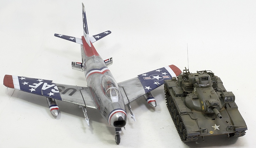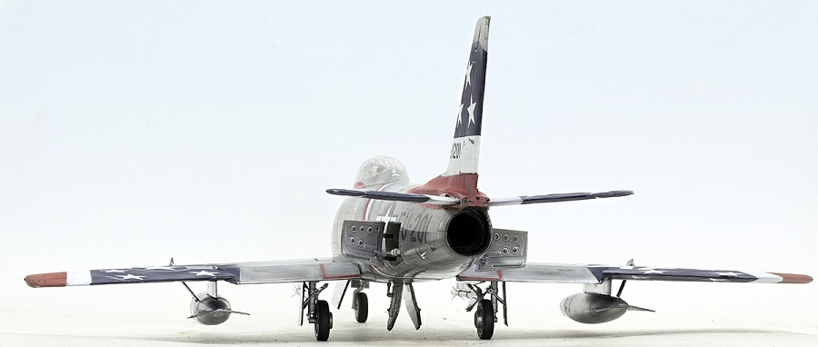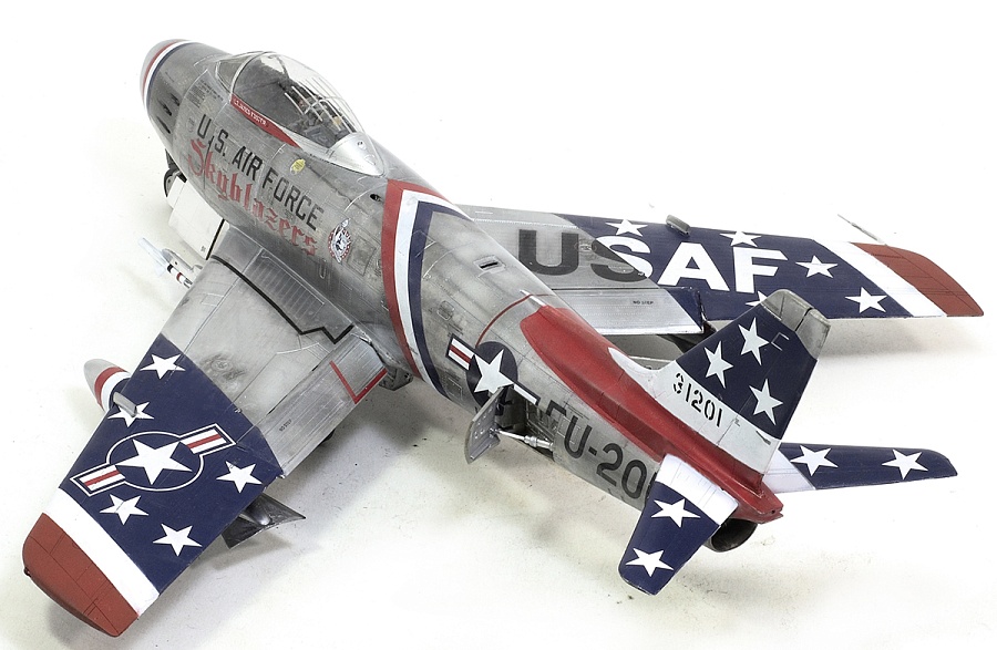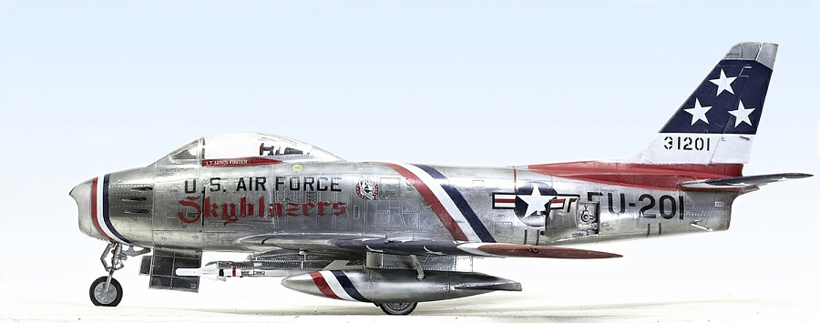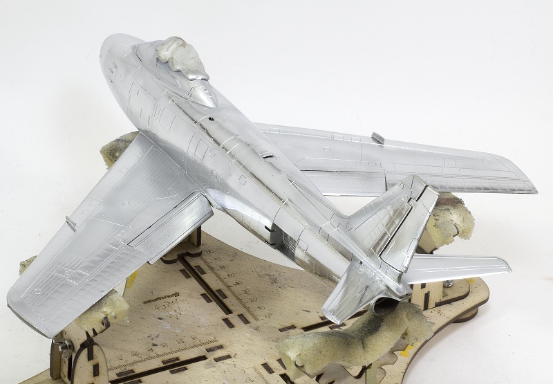 Привет всем!Всем известный самолёт F-86 Sabre от Италери(Кинетик). Сам КИТ старенький, отличается своей дубовостью и не очень хорошей стыкуемостью. И если правые и левые половинки фюзеляжа, который состоит из четырёх частей, стыкуются ещё прилично, то передняя и задняя часть просто очень нехорошо. Производитель даёт возможность  показывать потроха Сейбра и заднюю часть водрузить на тележку, как это часто делает Трумпетер. Планировал на этой модели продолжать эксперименты с покраской, в частности, захотелось изобразить не просто блестящую поверхность, но попробовать состарить это зеркало на поверхности. Дважды модель перекрашивалась Молотовым - первый раз неудачно, второй раз более удачно, но при сушке в сухожаровом шкафу дал температуру чуть большую, чем обычно, для убыстрения процесса - в результате повело винтом обе плоскости крыла и деформировался фонарь. Заменил оба крыла и фонарь. Перекрасил в конечном итоге Ганзой, на ней и проводил эксперименты по состариванию зеркала. В перерывах между покрасками даже поэкспериментировал с нанесением зеркальной поверхности с помощью химической реакции металлизации - реакции "серебряного зеркала". Серебрение получилось, но ушло в желтизну(уже знаю почему), пришлось переходить на обычные краски.Выбрал борт из группы авиашоу. Самолёт этот на фотках чистенький и вряд ли был ушатан так, как изобразил я, но добиваться именно такого, как на фото и не было цели. Вопрос с Сайдвиндерами тоже на моей совести - вряд ли они могли быть на аппарате для авиашоу, но поставил, так сказать, для "антуражу" )).....Знаю, не самая удачная моя работа, косячки есть, и не мало...некоторые заметил только на фото, но уж как получилось..., больше времени на этот КИТ у меня нет...Ждут другие не менее увлекательные проекты)...