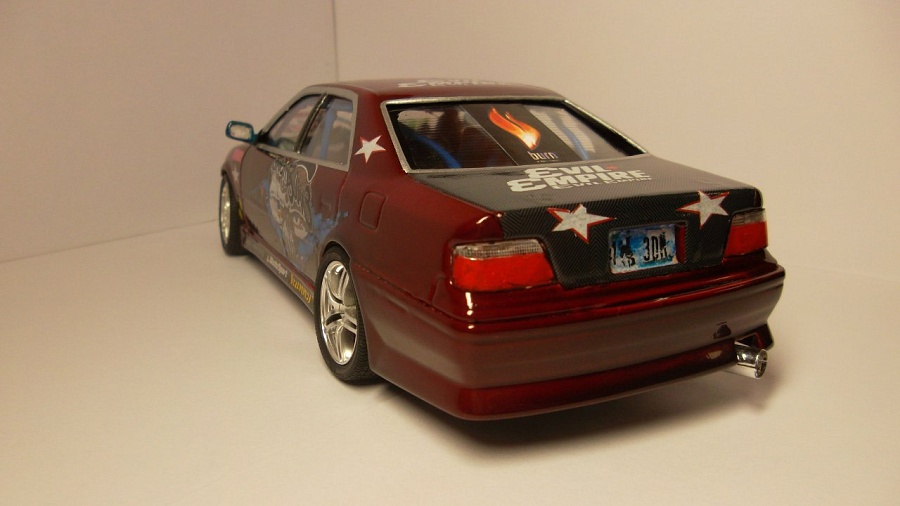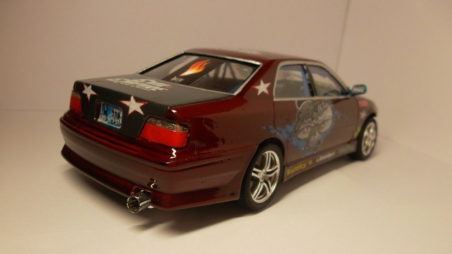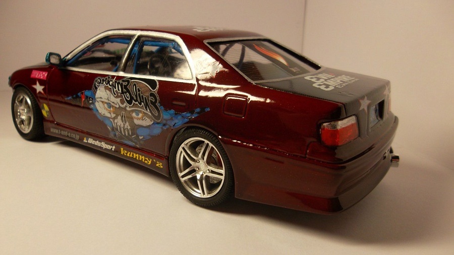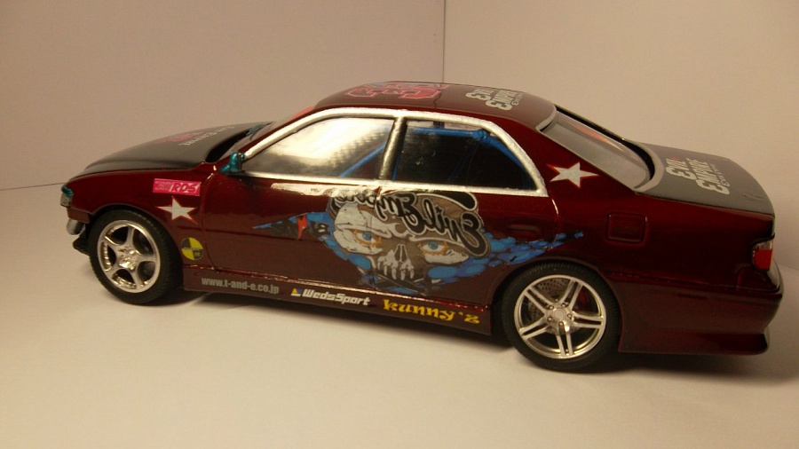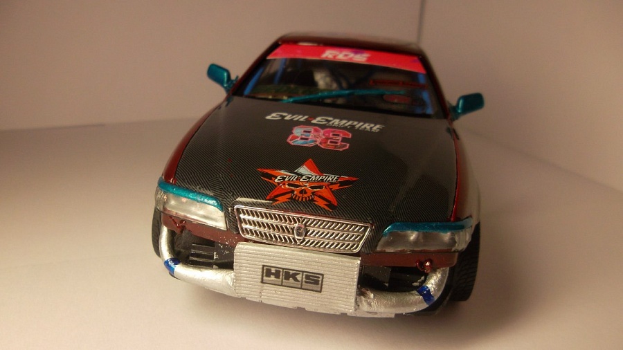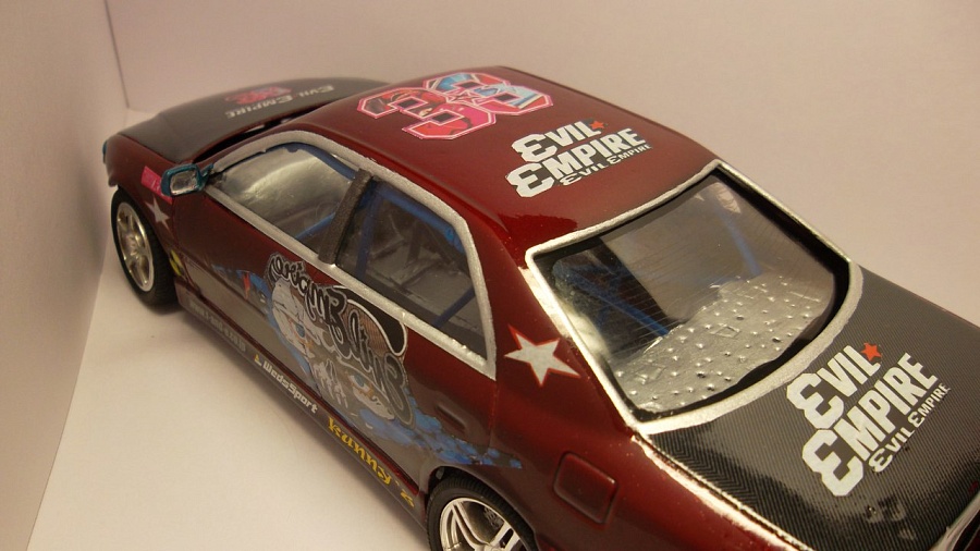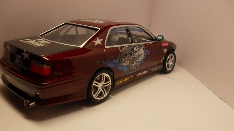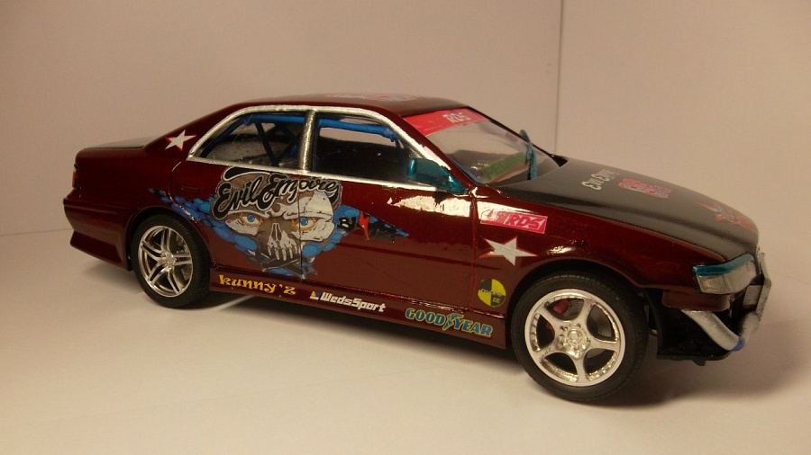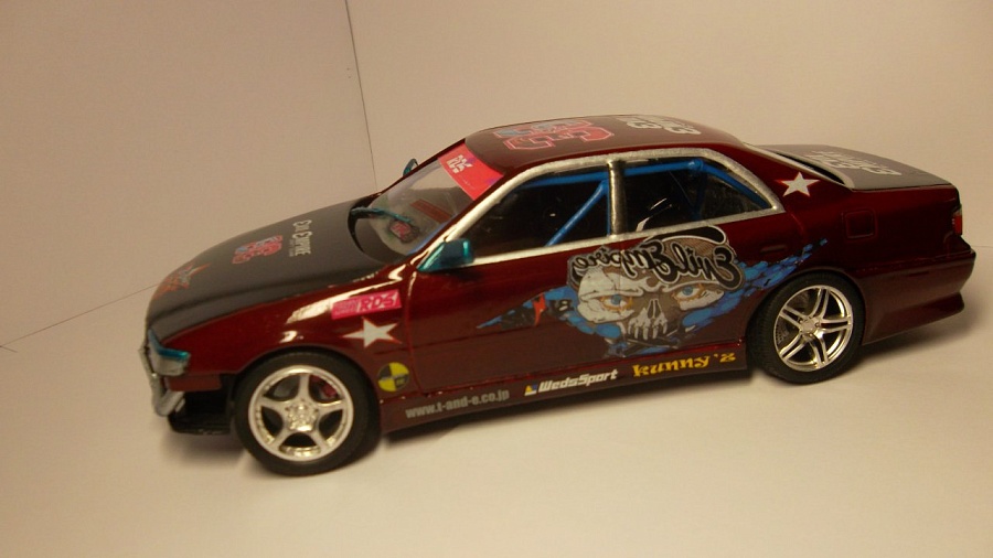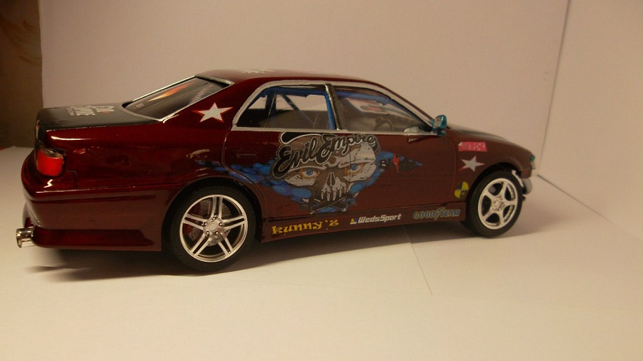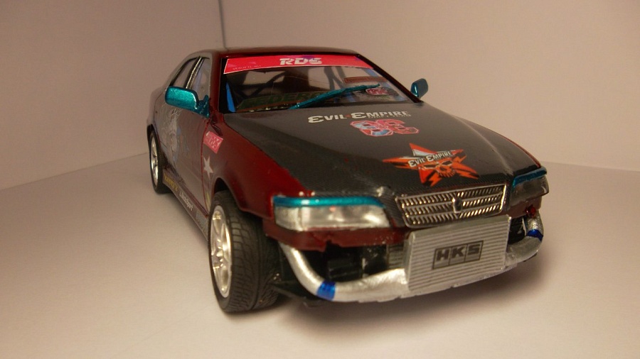| В общем как новичек на этом сайте ( форуме) выкладываю свою первую сборную масштабную модель автомобиля тойота чайзер в 100 кузове. Задумка была давно начать собирать и дорабатывать модели самому,стиль выбрал "дрифт" т.к очень сильно увлечён этим видом спорта. Итак начнём разговор о доработках: из доработок это голый салон,установка каркаса безопастности (собственно ручно собрал с 0 каркас безопастности,при сборе использовал медные электропровода),также из обычной граждаской панели приборов ( немного доработав) сделал спорт панель приборов с дополнительными датчиками,также заменил гражданские сиденья на ковш который шёл в наборе,далее по внешнему виду особо ни чего не изменял,кроме одного: переднего бампера,убрал его т.к после установки самодельного интеркуллера бампер просто не смог встать на своё законное место и поэтому было принято решение его убрать,что касается самого интеркуллера то он был сделан с обычной коробочки из под СД диска,патрубки были сделаны из литников,но с моей спешкой не очень хорошо получилось и решил сделать патрубки из модельного пластилина ( производитель пластилина TAKK),в будущем интеркуллер будет переделан и доработан! Перейдём к списку использованной мной краски при покраски масштабной модели: Тамия: цвета х1,х7,х11,х27; Мистер хобби H63; Акан: ярко-синяя (номер увы не помню); для покраски кузова использовал грунт/краску и лак от Босни (краска красный металлик); Также при доработке внешнего вида были использованы декали от думаю всем знакомого человека Айдара,карбон покупал у себя в городе (производителя увы не помню,упаковку выбросил). При полировке масштабной модели использовал финишную полироль от Тамии а также воск тоже от Тамии. В общем друзья смотрим,оцениваем,комментируем,обсуждаем,готов к адекватным оценочным действиям от вас. Скажу сразу,самому модель нравиться очень даже))). П.с если что не так написал или не то,простите пожалуйста сразу,не очень люблю всё расписывать,но в данном посте расписал все по пунктам). | |