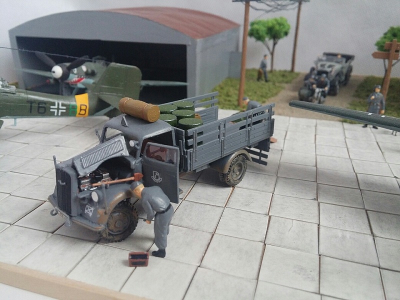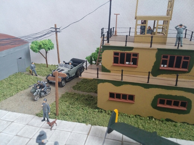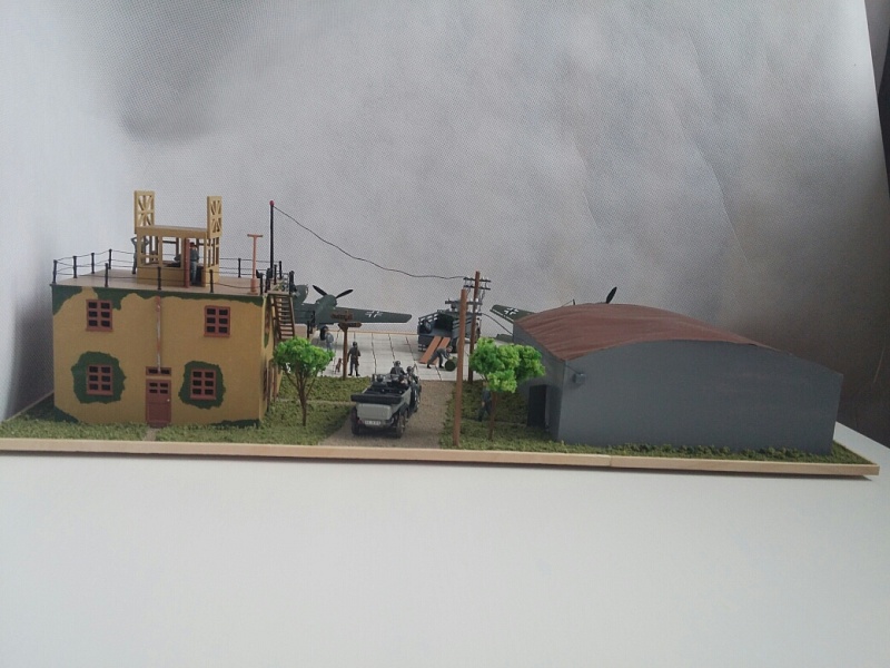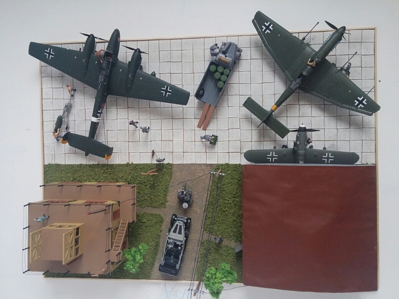 | Предлагаю Вашему вниманию диораму "В тылу врага". Сюжет такой: на немецкий аэродром приезжает "Важная шишка", а советские диверсанты уже заняли позицию для атаки. Моя первая большая работа в 72-м масштабе. Это некий собирательный, даже фантазийны образ немецкого аэродрома времен ВОВ. Специалистов прошу особо матчасть не копать, дабы избежать инфарктов и инсультов. А на самом деле критику воспринимаю с благодарностью. Пишите. Модели: Здание - Airfix Ангар - самодел. 109-й - Airfix. Из доработок, открыл кабину. 110-й - Airfix. Из доработок, открыл кабину. Лаптежник - Моделист. Изкаробка. Опель - Roden. Из доработок, открыл кабину и моторный отсек. (двигатель был) Бочки в кузове из старых запасов. Штабной автомобиль - ICM. Изкоробка. Мотоцикл - Звезда. Фигуры - 20 шт (Revell и Звезда). Водитель штабной машины - конверсия зенитчика Звезды. Все остальные изкоробка. Столбы и указатели - Italeri из старых запасов. Основание - самодел. Деревья самодел. Все окрашено акрилом (в основном Звезда). Кисть. | |