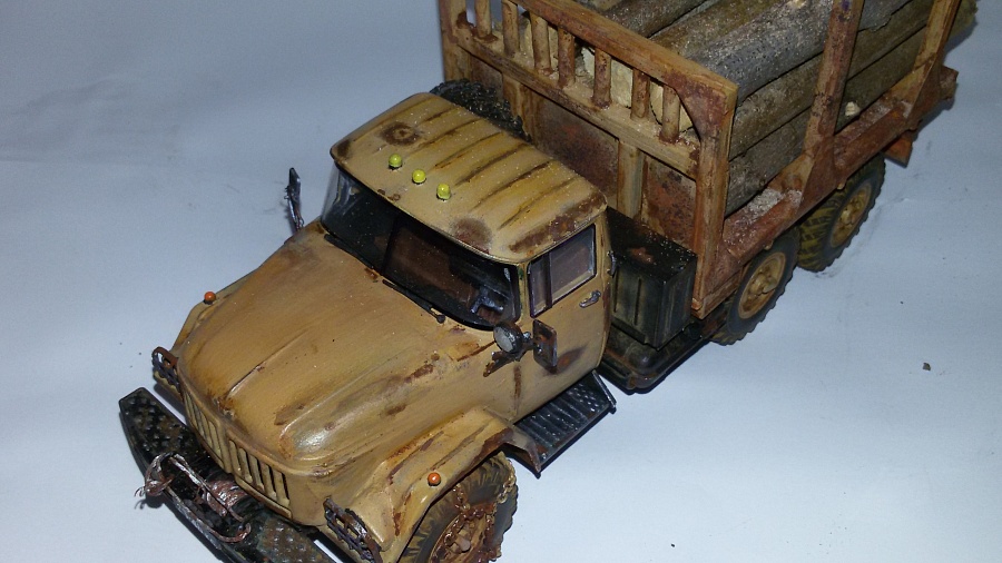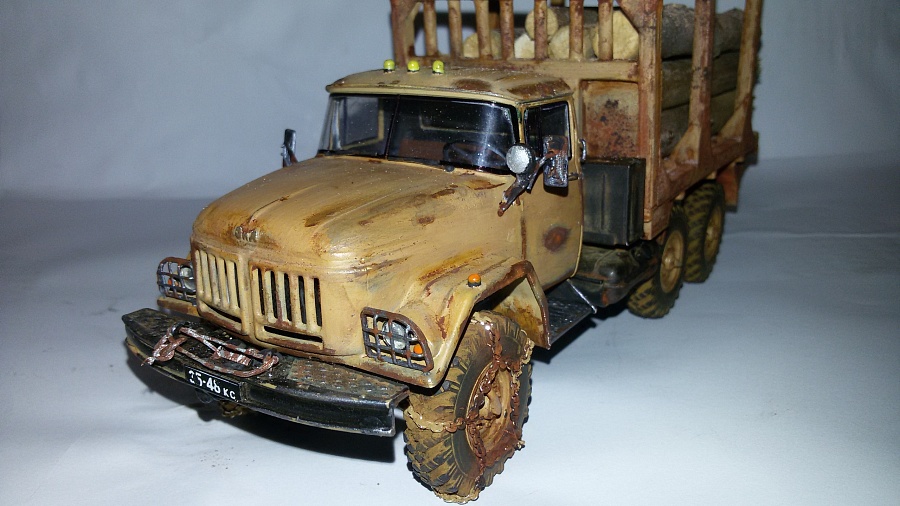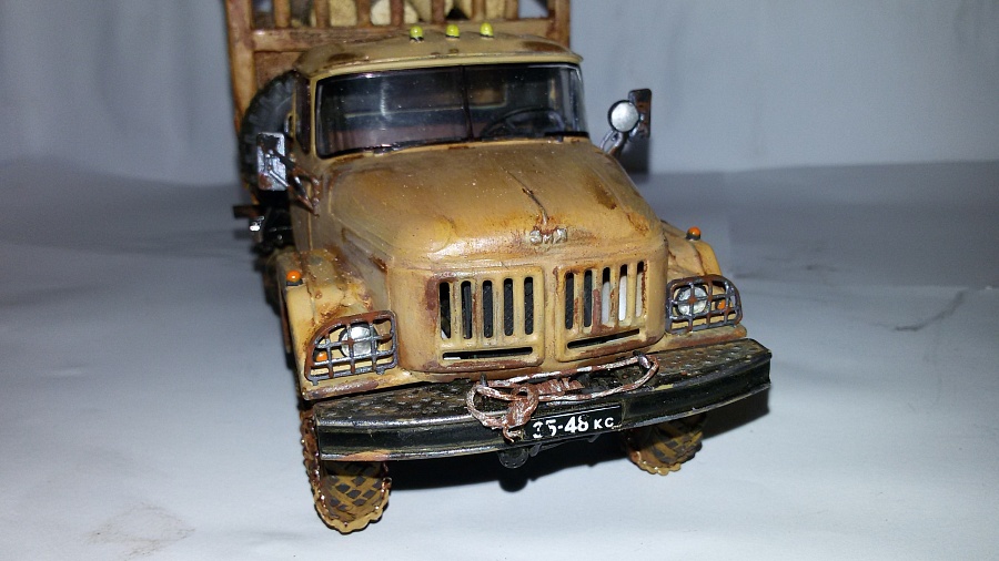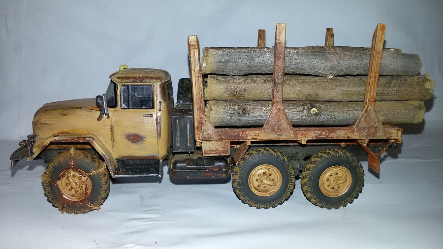 | Здравствуйте! Представляю свою модель Зил-131 от ICM, из модели я решил сделать старый лесовоз ,может показаться что он через чур ржавый, но я хотел сделать действительно старую ,но рабочую машину. При покраске модели использовал вороненую сталь от звезды, песечный и черный от тамии. Эффекты ржавчина и дорожная пыль. Лесовозную площадку я сделал коробки от dvd диска ,китайских палочек,крышки от доширака и пасты от ручки. Так же на передний мост я попробовал сделать из бижутерии цепи противоскольжения,ну вот что получилось. |