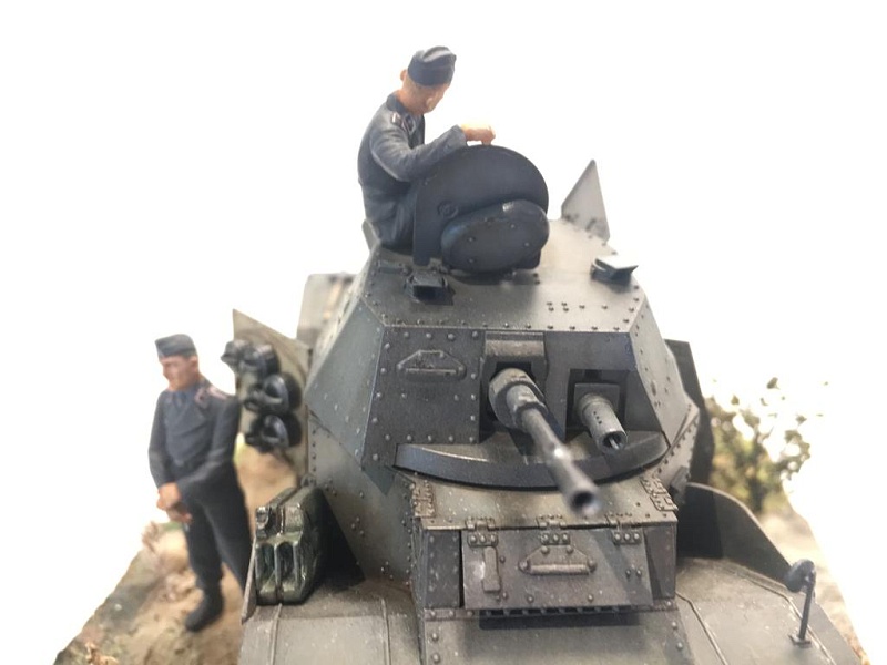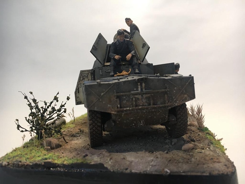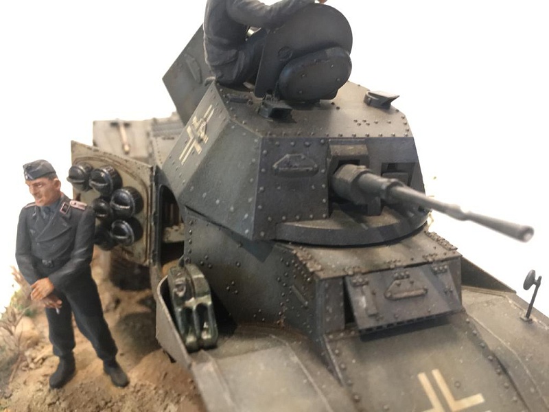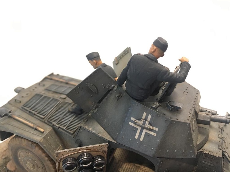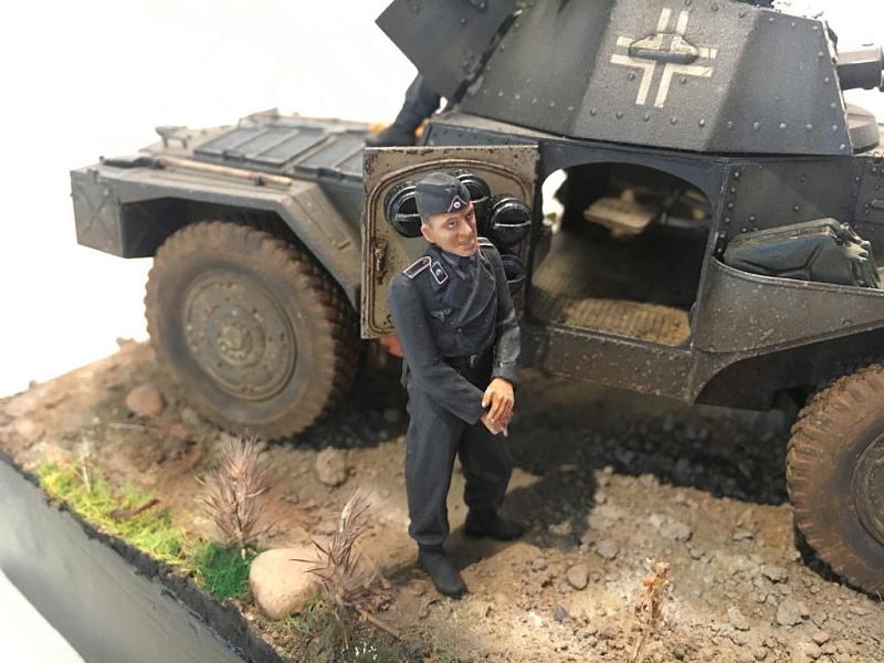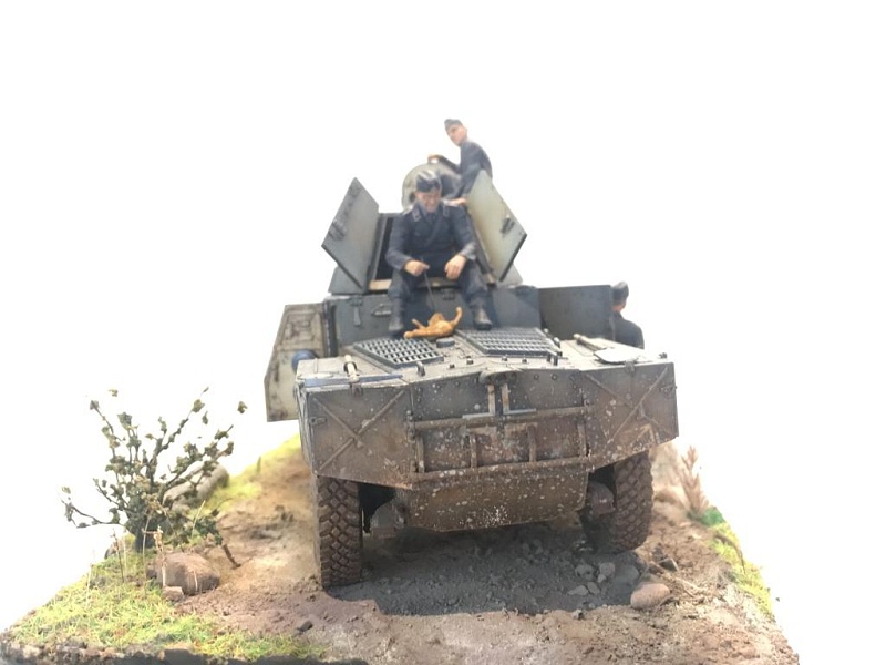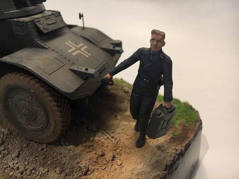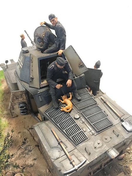 | Друзья, всем привет! Представляю вам модель французского бронеавтомобиля на службе в вермахте. Модель собиралась из коробки, только ствол пулемета заменил на иглу, да добавил пару канистр. Верхний люк сделал подвижным, но только для того, чтобы нормально подогнать члена экипажа под него, не совсем получилось, рука на люк не очень естественно опирается.Моторный отсек также собрал и окрасил, но открыть не получилось из-за кота, испортил, гад, разлегся там. От сборки модели самые приятные впечатления, все прекрасно встает на свои места, жаль, что интерьер башни "урезали", но и так хорошо.Окраска тамия и ганза. Захотелось оживить модель экипажем и зачем-то поставить на подставку, пришлось соорудить небольшую виньетку. Экипаж от ICM, окраска темперой, декали на фигурках тамия. |