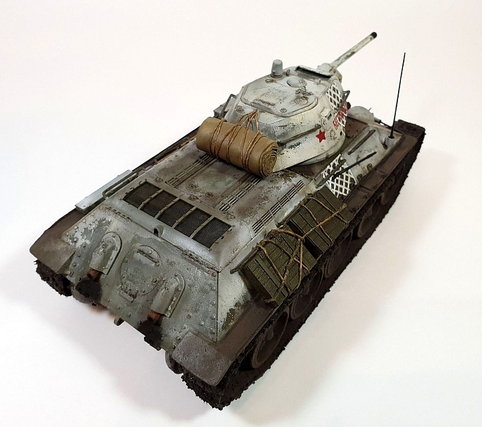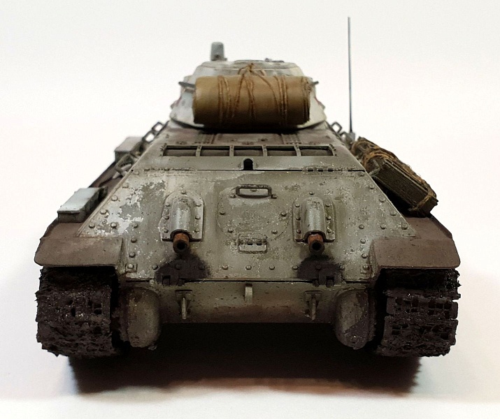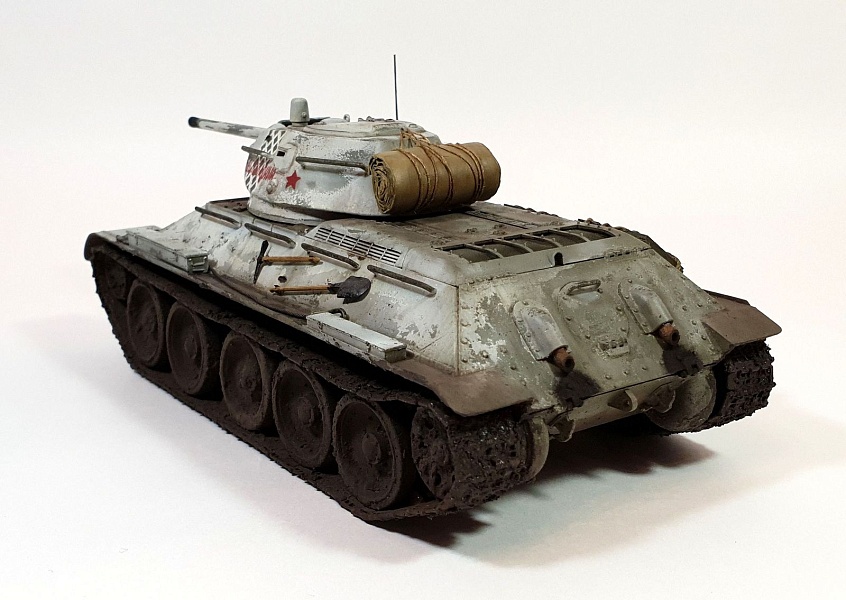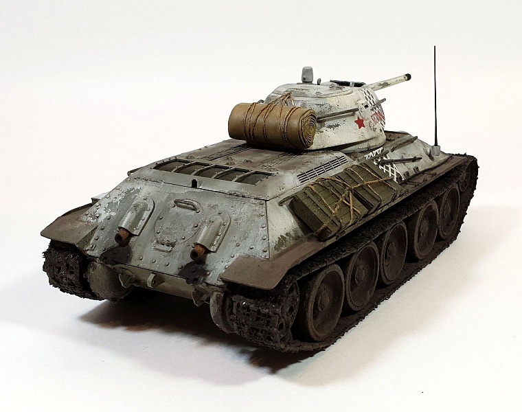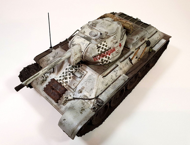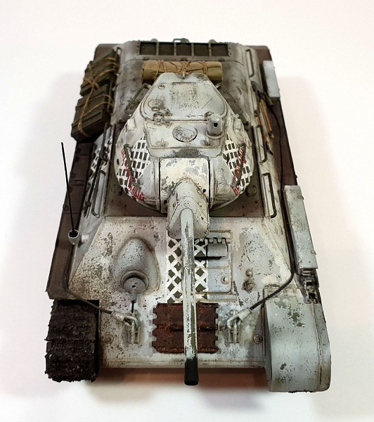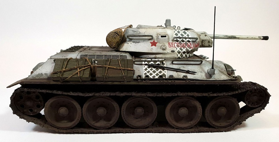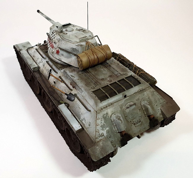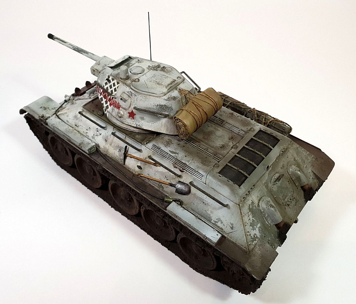 | Модель строилась в рамках ГБ в одной из групп ВКонтакте, по мотивам вышедшего в прокат фильма Т-34. Сразу оговорюсь, ПО МОТИВАМ. В наличие была только модель танка Т-34/76 от AFV Club (кит AF35S51, раритет), доработок до копийности танка в фильме никаких не делал из-за ограничений по времени. Поэтому наблюдательные коллеги-моделисты могут с удовольствием насчитать 10 отличий от представленной модели и танка, который был в кино).Итак, модель танка Т-34/76 от AFV Club (кит AF35S51), траки от Masterclub (кит MTL35022), трос Eureka XXL. Шанцевый инструмент взял из остатков различных наборов. Ящики из набора Miniart (кит 35064) "Советские 57-мм и 76-мм снаряды с ящиками" Скатка на башне сделана из тамиевской эпоксидки с использованием детской присыпки.Базовый цвет - краска Tamiya (XF3+51+58), зимний камуфляж (под названием "сетчатый" или в тырнете "зимний лес") лак-краска Tamiya (XF2). Смывка и масло от MIG. |