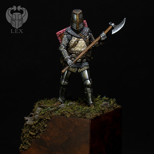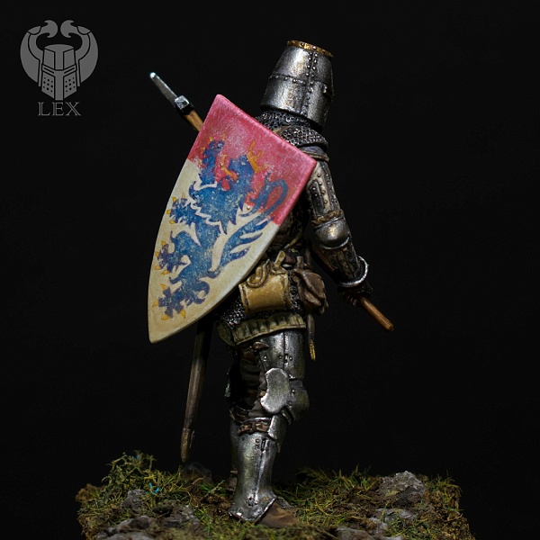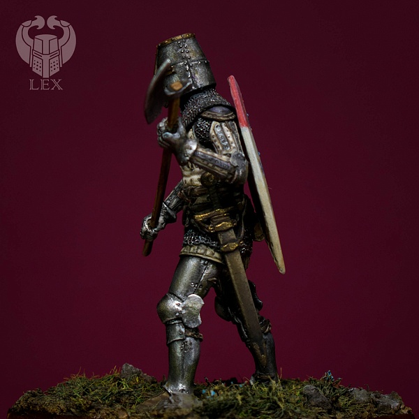| 19 сентября 1356 г. армия французского короля Иоанна Доброго догнала отступавшие войска английского принца Эдуарда недалеко от местечка Пуатье. Чем все закончилось нам хорошо известно, а начиналось это безобразие весьма любопытно. И речь о нем. В памяти французов еще свежо было Креси, где английский лук сделал свою мерзкую работу, обеспечив победу англичанам. Учитывая ошибки, Иоанн приказал своим воинам спешиться, чтобы рассеять лучников, поскольку, вопреки насаждаемым англичанами мифам, на самом деле для тяжеловооруженных французских рыцарей стрелы английских луков были, как слону дробинка. Сам король тоже спешился, взяв в руки боевой топор. Все его рыцари укоротили копья и отстегнули шпоры. Честно говоря, я не в курсе, был ли граф де Вандом именно в отряде короля. Хотя в пешем строю атаковал не только король со своими рыцарями, так что де Вандом вполне мог быть именно среди той части французского воинства, которому поступил приказ спешиться. Де Вандом был обоеруким. Поэтому топор он держит, как левша, а меч на поясе висит под правую руку. Шутка. Никто не знает, каким был де Вандом. Но вот такое объяснение мы с клиентом нашли для положения оружия в руках воина. На подставке произведена попытка изобразить поле, побитое тысячами лошадей и пехоты при подготовке к бою. И рыцарь изображен в самом начале этой атаки. Фигурка Тин Берлин, металл, 54 мм. Скульптор Олег Погосян. Шлем заменен. Согласно консультациям ув. Геннадия Даньшина, фигура вполне соответствует заявленному периоду, кроме перчаток, которые слишком прогрессивные. Хотя, с очень большой натяжкой и их, по его словам, можно включить. Герб де Вандом - лазурный лев с золотыми когтями, короной и языком на серебре с красной главой. Роспись акрилом и маслом | |