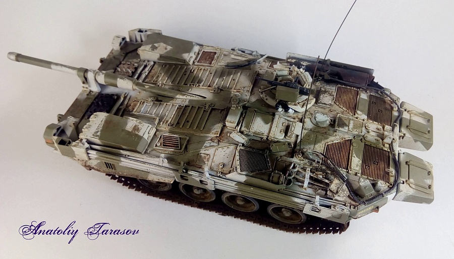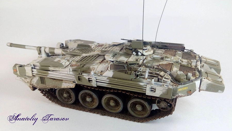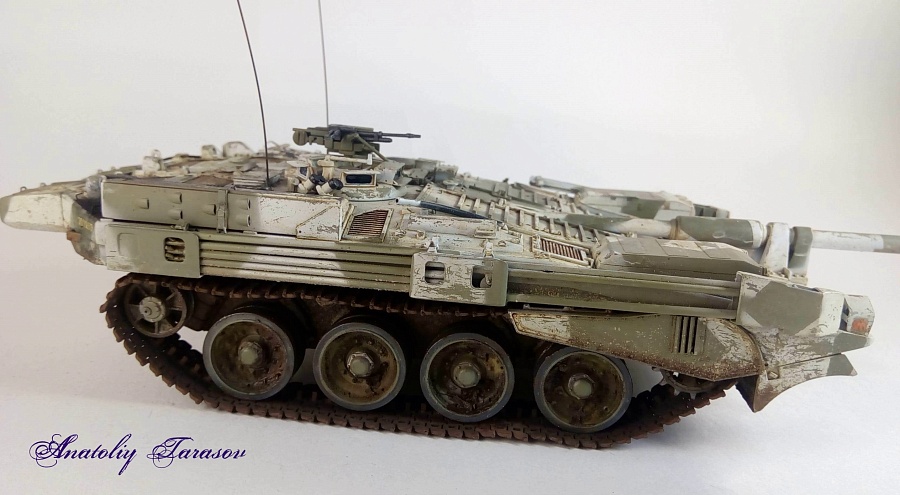 | Давным-давно, в Артиллерийском музее (Санкт-Петербург) был приобретён... Strv 103B В общем, превратилось всё в долгострой. В один Из прекрасных дней коробка была в очередной раз откопана и сборка завершена. Что сделано (доделано): 1. Все скобы, петли, ручки заменены на проволоку подходящего диаметра. 2. Ремни для крепления шестов экрана и шанцевого инструмента изготовлены из модельного скотча TAMIYA и фольги. 3. Из тонкого пластика (крышка лапши Доширак) изготовлены створки на смотровые приборы и некоторые мелкие детали. 4. Добавлен трос с крюками (более поздними, но мне они понравились визуально). 5. Кусочками пластика заменены фторопластовые втулки в опорных катках ("родные" слишком мягкие и катки выворачивает при малейшей нагрузке). 6. Траки заменены на ранние наборные траки Trumpeter (отдельный набор, недостаток - слишком слабые пальцы, которые требуется заменить на проволоку). Грунтовка - TAMIYA из баллончика. В качестве варианта окраски выбрал зимний "оскольчатый" камуфляж (в сети увидел очень эффектную работу зарубежного коллеги-моделиста, с которым познакомился совсем недавно в Facebook после того, как опубликовал фотографии своего Strv 103B). В инструкции к модели указано, что в качестве основного цвета необходимо использовать RLM 02. Однако, если в баночке смотрелось всё весьма достойно, то после пробной окраски модель выглядела так, как будто на её высыпали мелкую пыль. Пришлось мешать цвет и перекрашивать. Декаль при попытке её перевести начала рассыпаться, поэтому пришлось декаль покрыть лаком и только потом переводить на модель. Выхлоп был окрашен различными цветами ржавчины а потом "ободран" (при помощи лака для волос). Маски для оскольчатого камуфляжа были сделаны из модельного скотча TAMIYA.Для нанесения потёртого зимнего камуфляжа воспользовался техникой "лак для волос".Сколы наносил жёсткой кистью и зубочисткой. В качестве смывки использовал AMIG 1203 STREAKING GRIME (впервые в своей практике). Загрязнение ходовой - пигменты ZIP Maket. Модель была закончена в далёком 2016 году. Работать с этой моделью было интересно: есть где развернуться. До сих пор лишь Trumpeter делает два варианта Strv 103 (B и C). Так что модель безальтернативная. |
