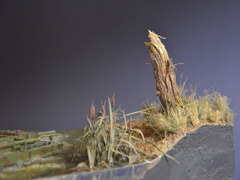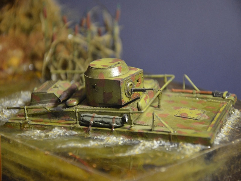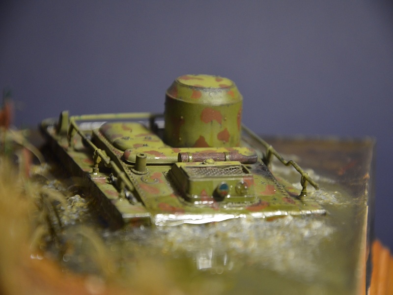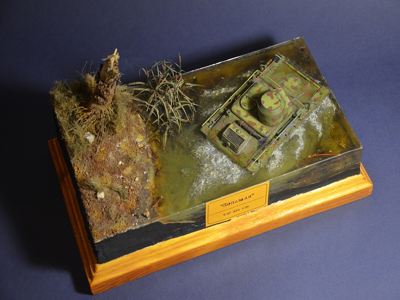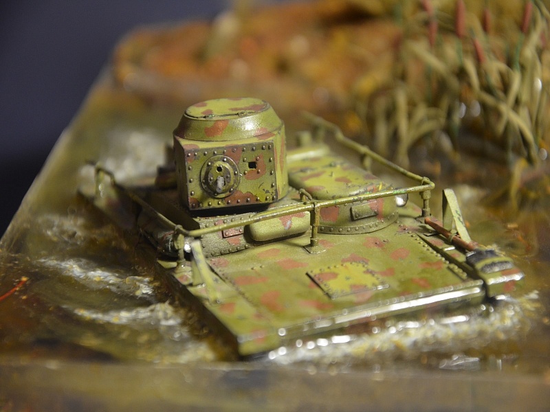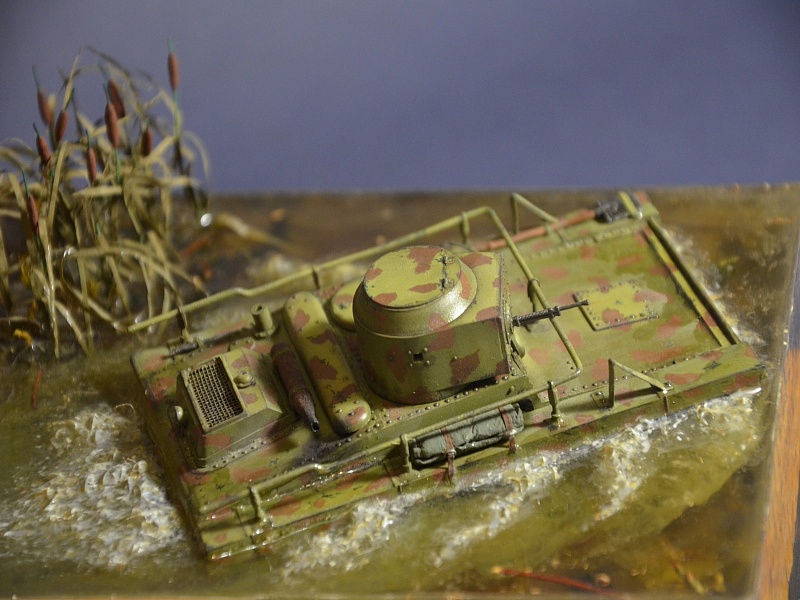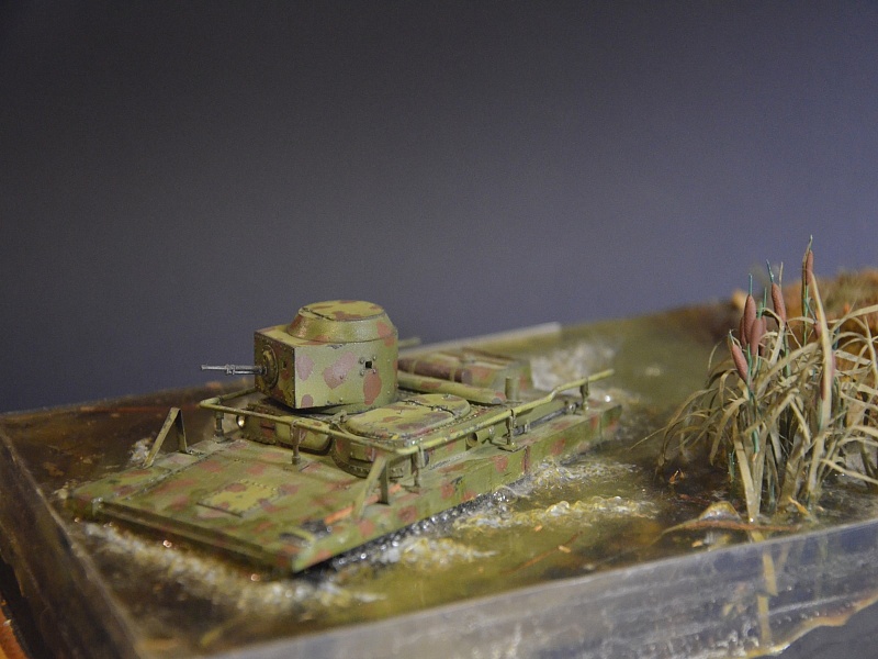 | Доброго времени суток, уважаемые коллеги по хобби! Представляю свою первую работу, выложенную на данном ресурсе, а также первую мной созданную виньетку, под названием "Поплыли". Строилась она в 2016 г. Модель танка Т-37 - достаточно известные дровишки от МSD )) Изначально планировал как модель выходного дня, но так как траки полностью я "победить" не смог, пришла идея сделать танк плывущим. И траки скрою, и воду попробую делать...вообщем одним выстрелом... На самой модели особо в матчасть не углублялся. Немного доработал фары, высверлил ствол, выхлопную трубу, сделал скатку с креплениями. Также добавил "отбойники" на крыльях (не знаю как правильно называются). По подставке: Основа- деревянная доска, далее пеноплекс, гипс и ЭДП. Дерево- сушеный корень. Также использовал сушеный чай, разные камушки и ветки. Рогоз- проволока, эпоксилин и пергамент. Химия: краска Tamiya, пигменты MIG и ZIP. Приятного (надеюсь) просмотра! ) |