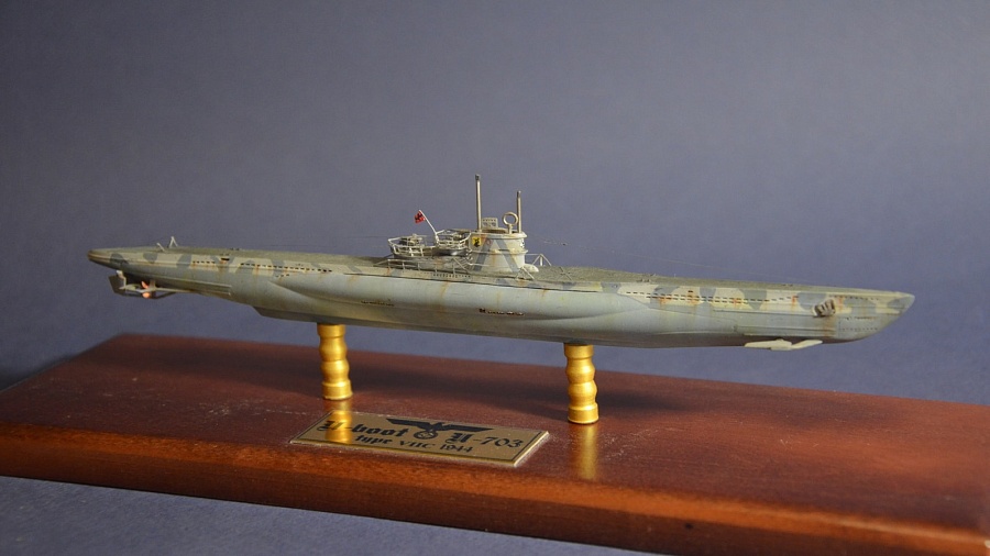 Здравствуйте, уважаемые коллеги!Представляю вашему вниманию свою первую пробу в судомоделизме.Модель от фирмы Флагман U-boat VIIC.Прототипом была выбрана лодка с номером U-703, из за своего необычного камуфляжа. Эмблема подводной лодки:![]() Доработки: