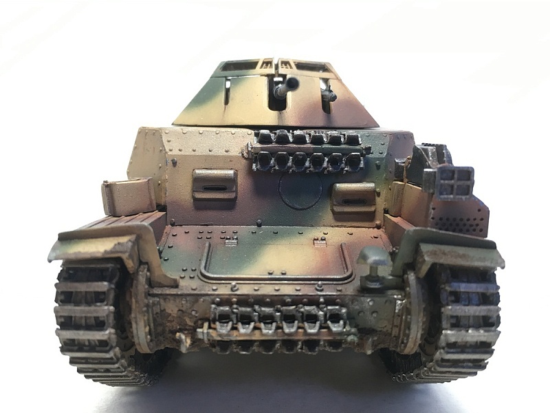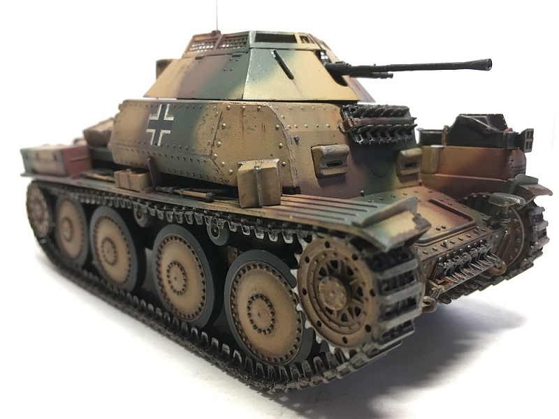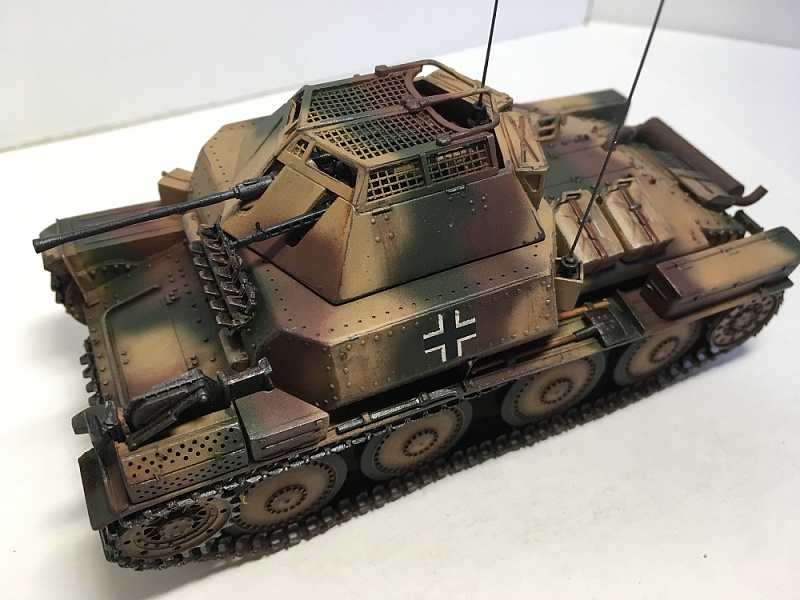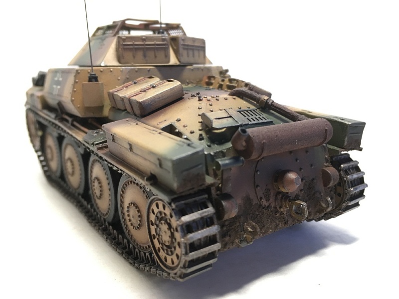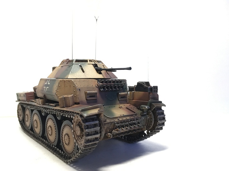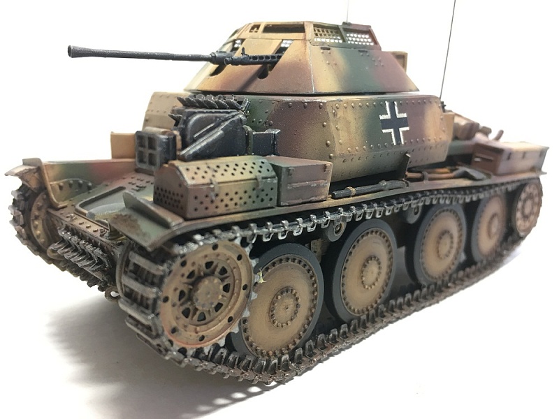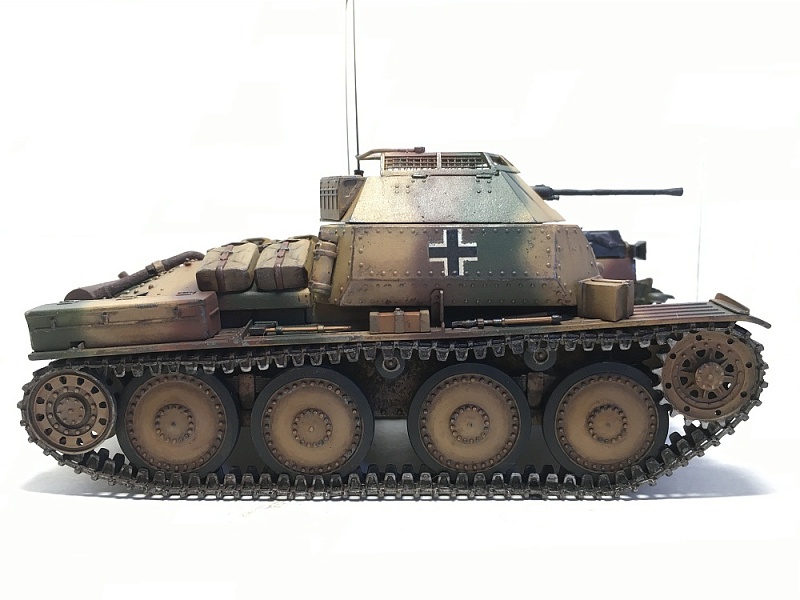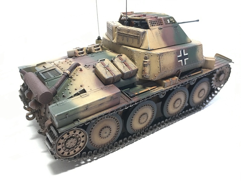 | Закончил очередную модель от АРК Моделс, на этот раз разведывательная бронированная машина на базе Праги 38(t) Это наверное была самая сложная в плане "сроста" деталей корпуса модель от АРКа, что доводилось мне собирать. Хотя в перепаке от "Восточного экспресса" инструкция и деталировка подгонки уже более внятная, по этому обратите внимание при выборе модели для сборки, но всё равно для начинающих моделистов я бы не рекомендовал эту модель. Из допов: канистры, сетка на каркас люка, антенны, заслонка на воздуховод. Красил красками Тамия, смывка Тамия, пигменты ZiP. Не много о прототипе: В начале 1944 года началось производство новых бронированных машин Aufklarungspanzer (Sd.Kft 140/1) на базе хорошо зарекомендовавшего себя шасси лёгкого танка 38(t). Разведывательный танки Sd.Kfz140/1 оснащались вращающейся башней, вооружённой автоматической пушкой KwK 38 и спаренным с ней пулемётом MG-42. Сверху башня закрывалась каркасом с проволочной сеткой, защищающей от попадания ручных гранат внутрь боевого отделения. Новый усовершенствованный двигатель Прага АС позволял развивать приличную скорость до 65км/ч. Всего было выпущено 37 танков SD Kfz 140/1 в феврале и 33 машины в марте 1944 года. Машины имели кодовое обозначение «262». Разведывательный танк Sd Kfz 140/1 Aufklarungspanzer стал последней разработкой КБ BMM чехословацкого завода, который был создана на базе танка Pz Kpfz 38 (t). | |