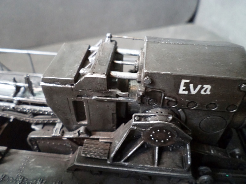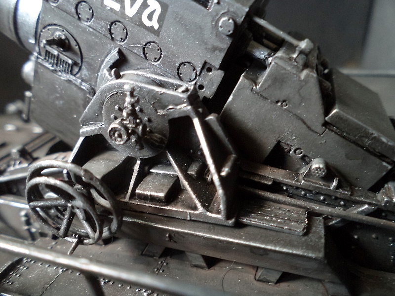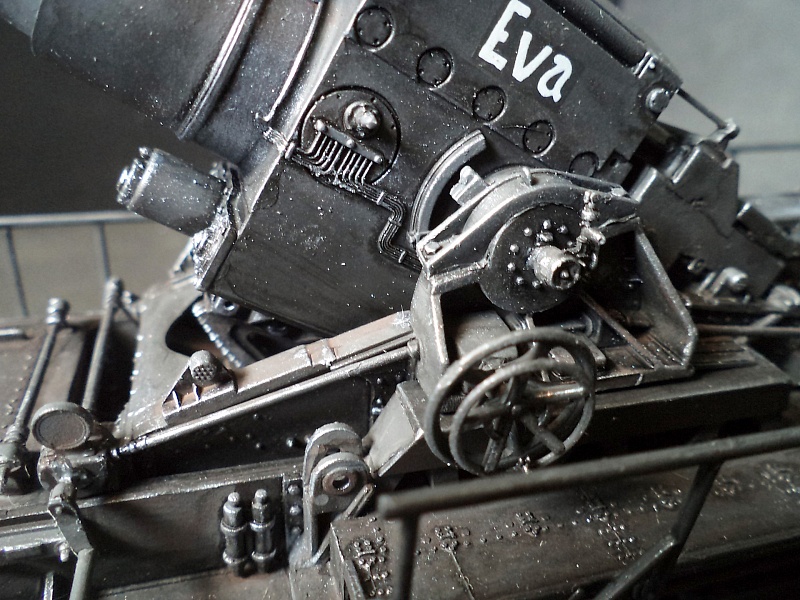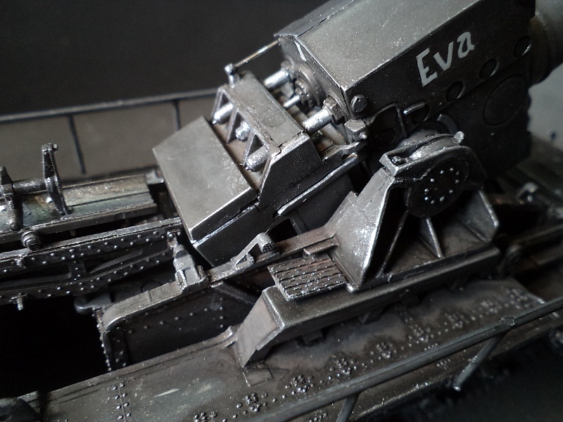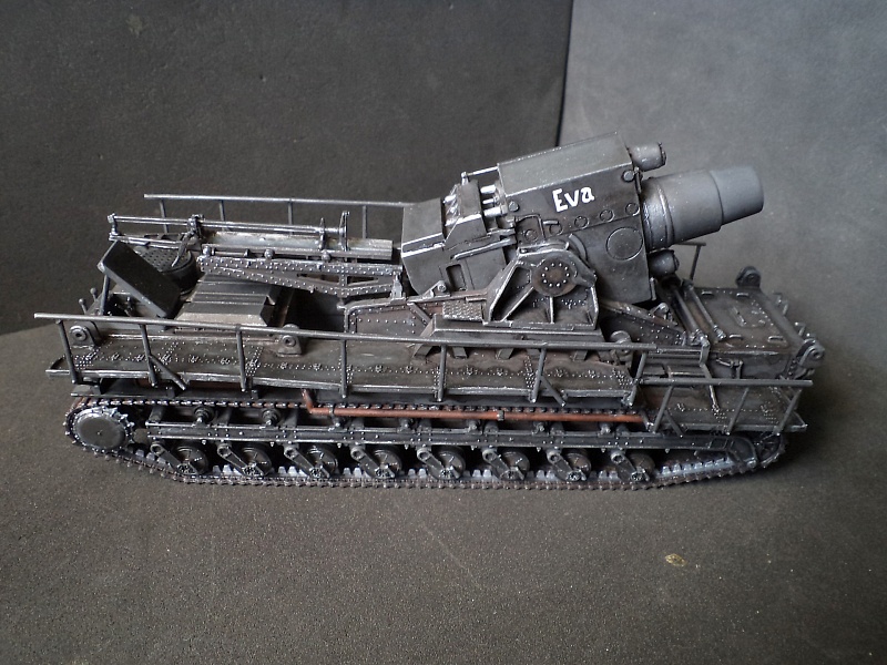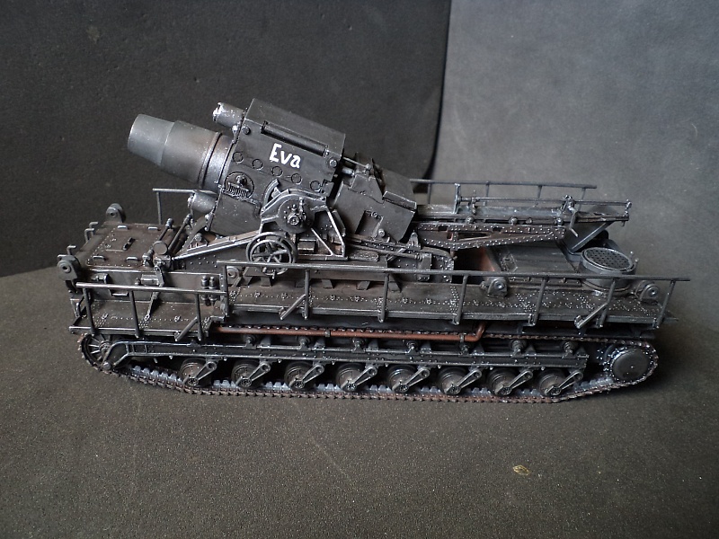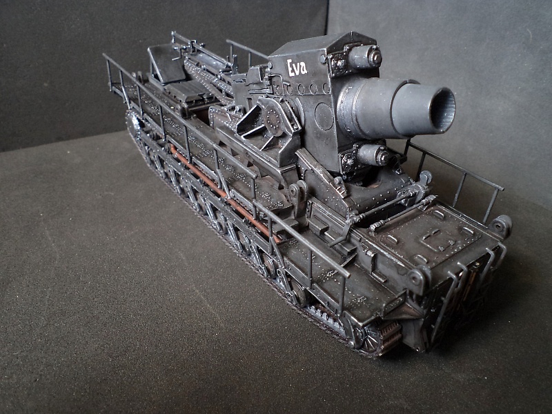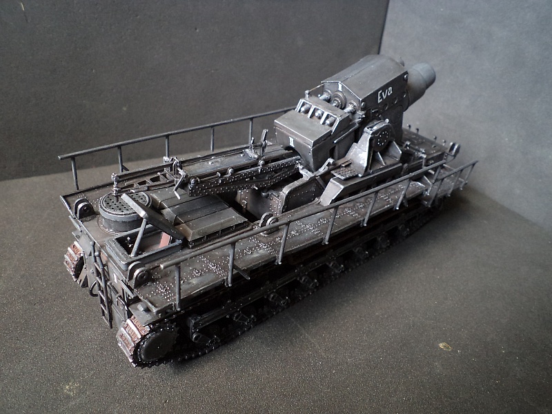 | Самоходная мортира «Карл» (нем. Gerät 040 - изделие 040; после модернизации - нем. Gerät 041) - немецкая тяжёлая самоходная мортира периода Второй мировой войны. Всего было построено семь экземпляров. Использовались при штурме крепостей и сильно укреплённых позиций противника. Фирма «Рейнметалл-Борзиг» изготовила один прототип и шесть боевых самоходных мортир. Поскольку установки были единичными изделиями, каждая из них получила собственное имя: I - «Адам» (нем. Adam), позднее переименована в «Бальдур» (нем. Baldur); II - «Ева» (нем. Eva), позднее переименована в «Вотан» (нем. Wotan); III - «Один» (нем. Odin); IV - «Тор» (нем. Thor); V - «Локи» (нем. Loki); VI - «Циу» (нем. Ziu); VII - «Фенрир» (нем. Fenrir) - прототип - не участвовал в боях. В ноябре 1940 года первая мортира, «Адам», была передана в войска. До середины апреля 1941 года были сданы три установки - «Ева», «Тор» и «Один», а к концу августа ещё две - «Локи» и «Циу». Существовала также седьмая установка, названная именем «Фенрир», однако она использовалась в основном для испытаний и не применялась в боях. Возможно, под этим именем имеется в виду установка-прототип, построенная в мае 1940 года. Модели в масштабе 1/72 выпускают Hobby Boss и Hasegawa. В данном случае представлено орудие с 60см стволом и ранней ходовой частью, имеющее имя собственное Eva. Собрано из коробки, крашено акрилом, ржавчина Wilder. 2015-04-25 |