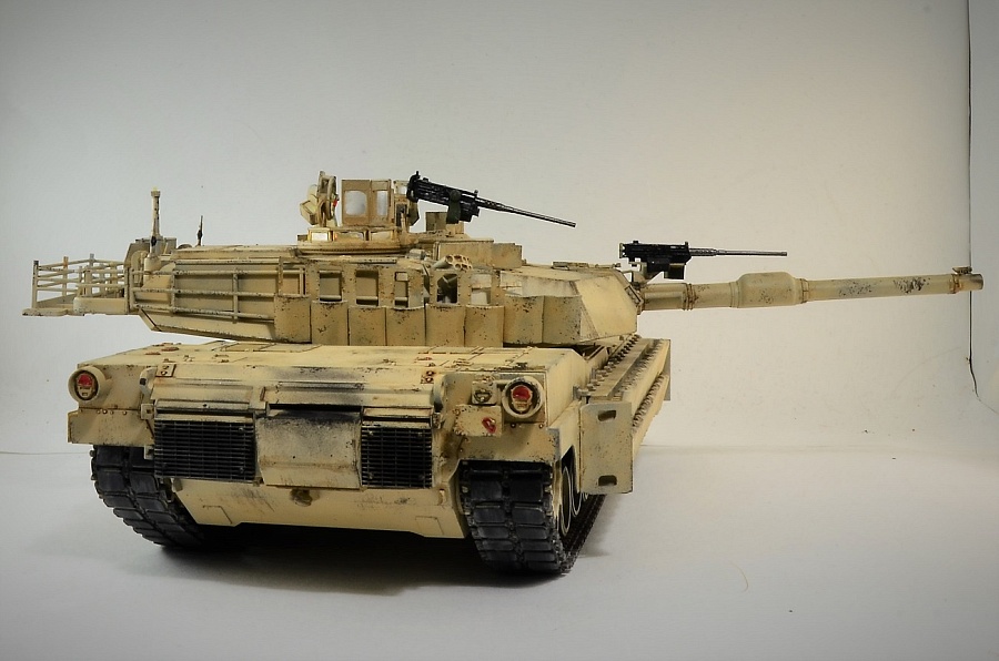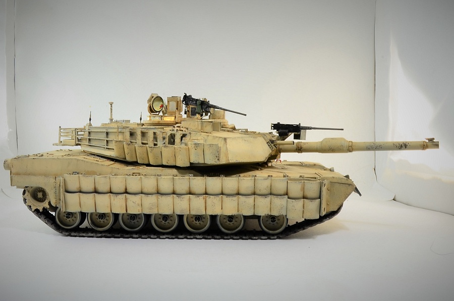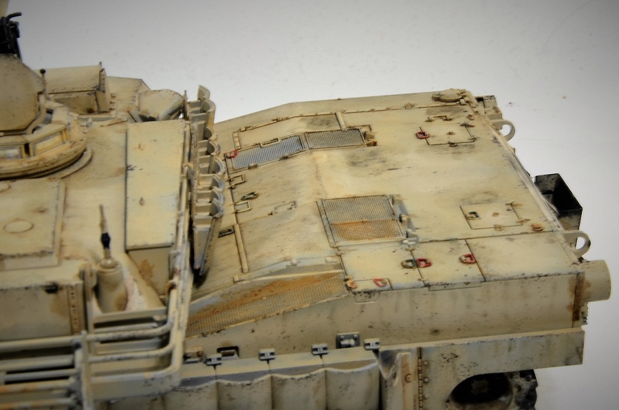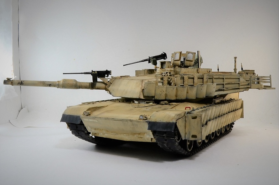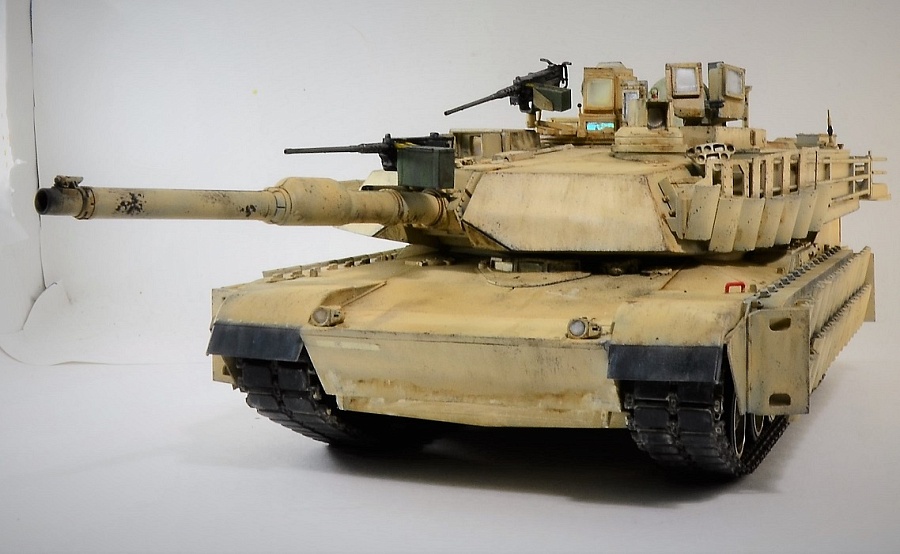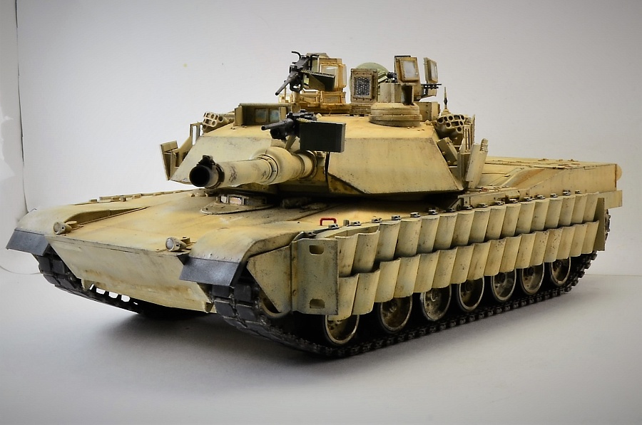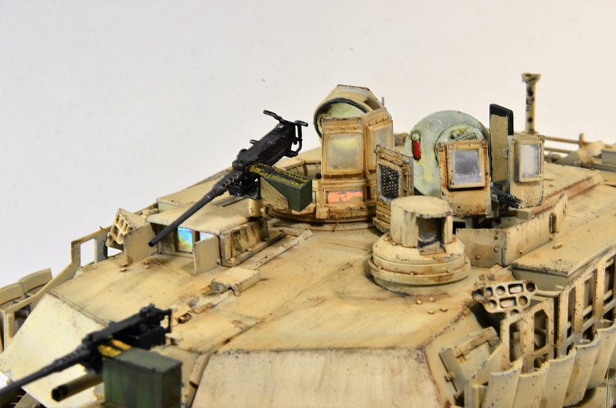 3) а вот ваш конкретный танк логичнее было бы сделать таким ободранным, но при этом комплекты навесной защиты TUSK 2 поставлялись в войска и ставились на уже повоевавшие машины - так что "черепица" должна быть по идее сильно новее чем сам танк. Об этом можно посмотреть здесь: