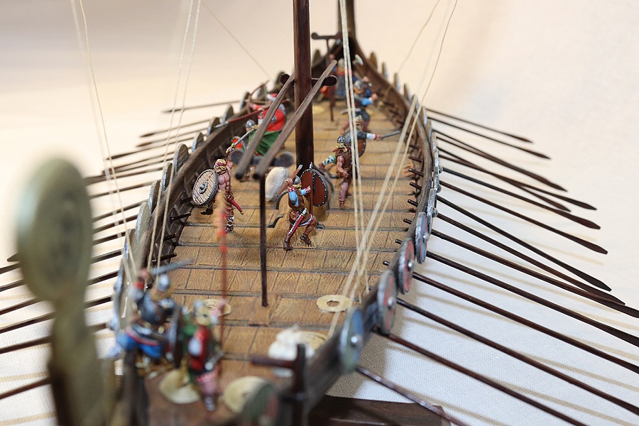 Драккар, отдельно от фигурок, смотрится симпатично. Рукоятки вёсел ( вальки) длиннее бы и скамейки для гребцов, модель бы выглядела целостнее.