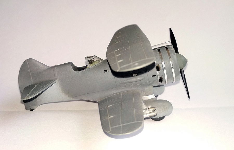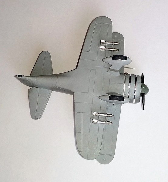 Основные доработки: удалена часть фюзеляжа, где располагались убираемые шасси, с нуля выполнены стойки и обтекатели шасси, добавлен обтекатель пулемета с правой стороны, заново выполнен воздухозаборник сверху на передней части фюзеляжа, изменены положения некоторых выхлопных труб. Доработана кабина. Высверлены световые отверстия в верхней части панели кабины и добавлен прицел из проволоки и тянутого литника. Пулеметы выполнены из игл шприца. Из тянутых литников заново выполнены тонкие стойки биплановой конструкции крыльев. Кое где прошелся скрайбером. Для солидности решил сделать дополнительное вооружение в виде ракет на подвеске. Направляющие ракет от Ил-2 «Восточного экспресса» установлены на штатную подвеску модели.