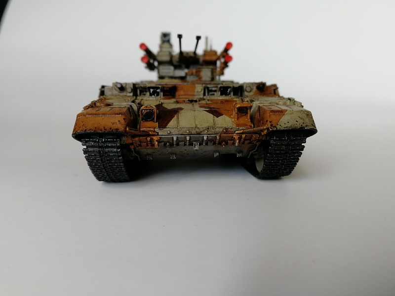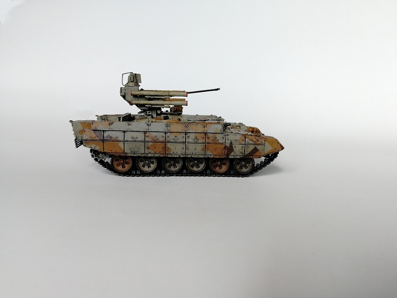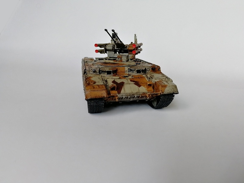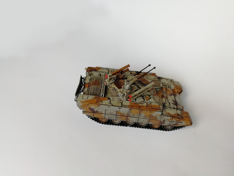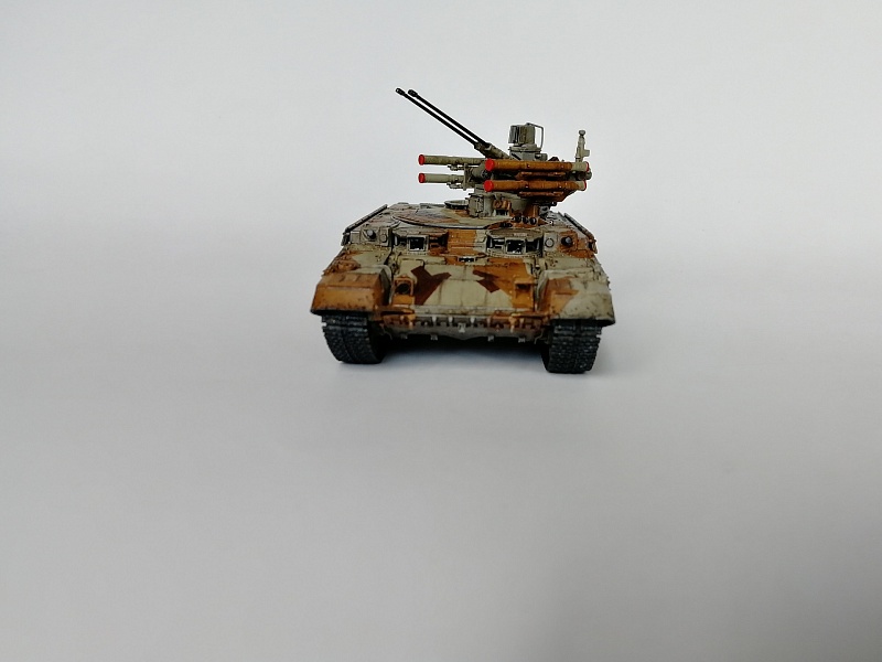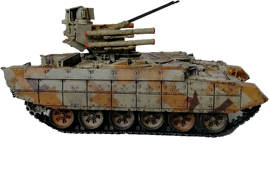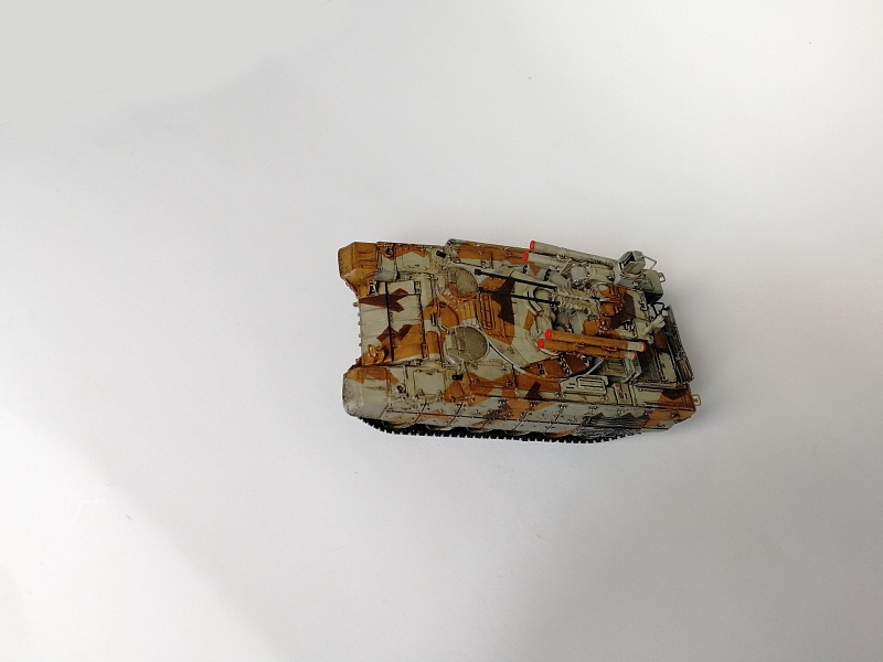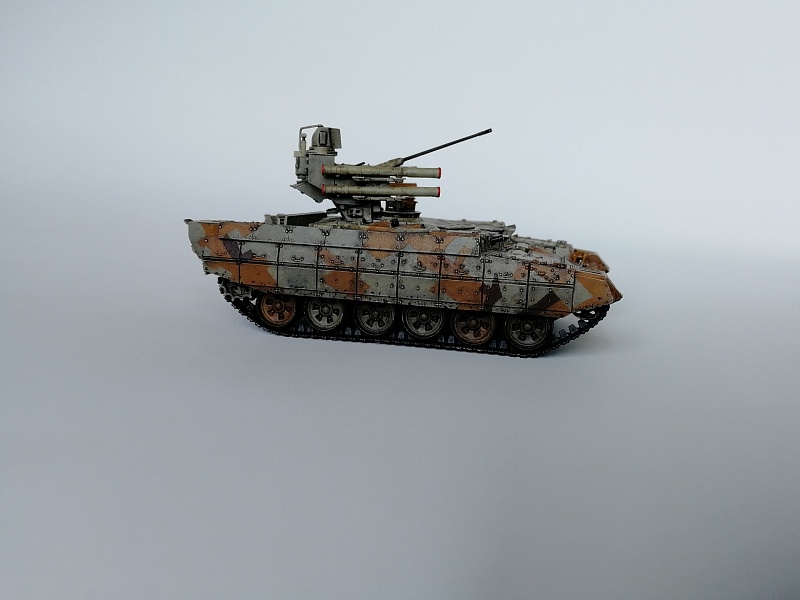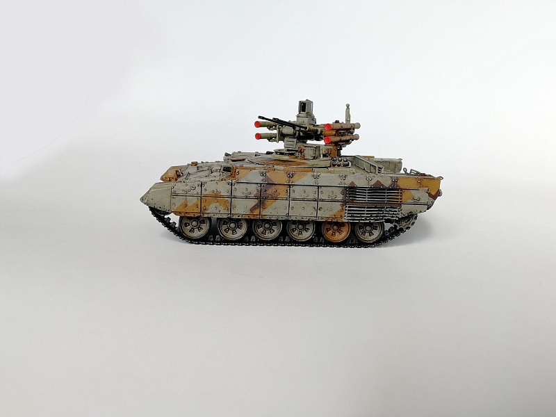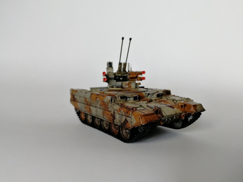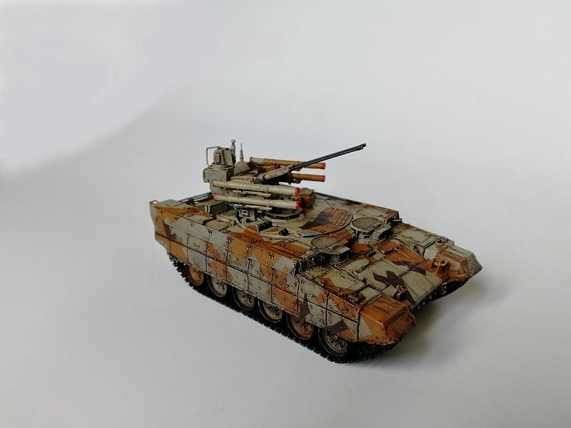 | Здравствуйте уважаемые коллеги по хобби.Представляю свою работу - БМПТ "Терминатор" оот Звезды.И сам кит, и прототип достаточно известны, поэтому, останавливаться здесь не буду. Сборка из коробки, за небольшими исключениями: использовал набор от Zedval (стволы и антенный ввод), тросс eureka, кое-где проволока(хотя с такой толщиной, как у меня имелась, вазможно и не стоило вообще её использовать). Окраска: тамиевский грунт из балона, звездовский акрил кистью, тамиевские лаки из балона, коричневый фильтр вайлдер, коричневая смывка тамия. Замахнулся на оскольчатый камуфляж, но, наверное, переоценил свои силы- по итогу воспроизвел его упрощенно.Фоткал на фотик, телефон, выбрал что получше, ужал в пэинте.Приятного просмотра, жду советов и конструктивной критики |