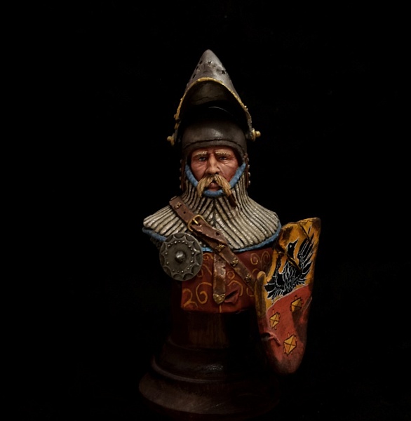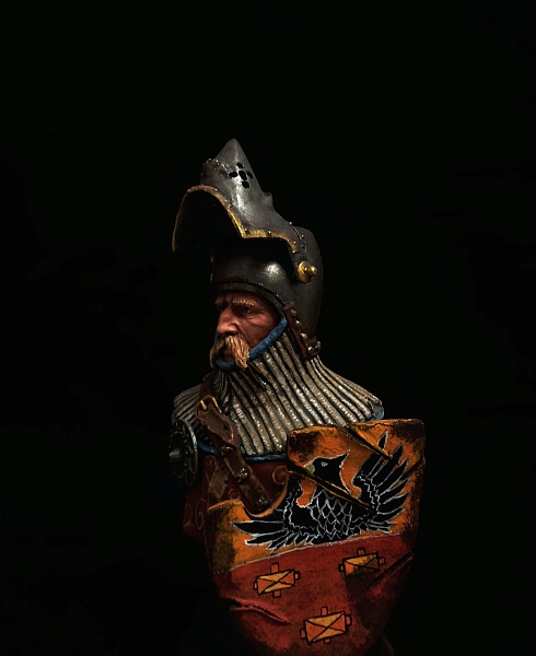 Зави́ша Чёрный из Гарбова герба Сулима (польск. Zawisza Czarny, Завиша Чарны; ок. 1379 — 1428, Сербия) — польский рыцарь и дипломат первой половины XV века. Символ рыцарства и благородства. Завиша служил в войсках императора Священной Римской империи Сигизмунда. При вести о походе Ягайло против Тевтонского ордена Завиша поспешил в Польшу и сражался в Грюнвальдской битве(1410 год). Исполнял важные поручения Ягайло на соборе в Констанце и при английском и французском королях. Впоследствии Завиша снова поступил на службу императора Священной Римской империи. Славу непобедимого рыцаря приобрёл на турнире в Перпиньяне, одним ударом копья выбив из седла знаменитого рыцаря Иоанна Арагонского. Пал при попытке освободить от турок Голубацкую крепость на Дунае в 1428 году. В Костёле Святого Франциска Ассизского в Кракове ему был установлен символический надгробный памятник. Родовое кладбище рода Завиши Чёрного располагалось возле озера Любленского в городе Гомеле. Роспись ПВА темпера, масло, акрилы. |
