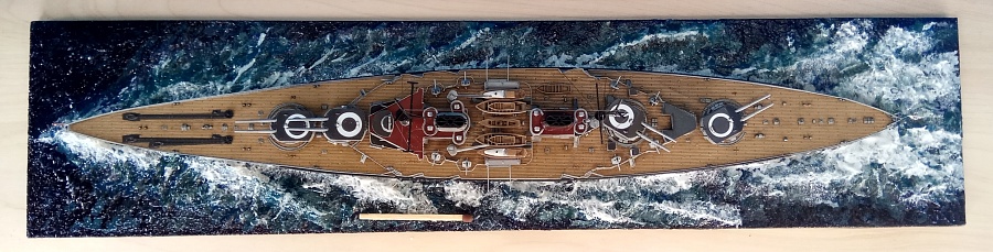 | Модель линейного крейсера SMS Derfflinger от FlyHawk. Масштаб 1/700. Комплект с фототравлением, металлическими стволами ГК и смоляным бипланом, сборка которого, в семисотом масштабе стала серьезным испытанием нервов. По этой причине, в финальную композицию он не попал.Окраска по инструкции акрилом Mr.Hobby (с некоторыми условностями). Вода - первая серьезная попытка, не сильно удалась, но не отбила желания продолжать над ней работать. |