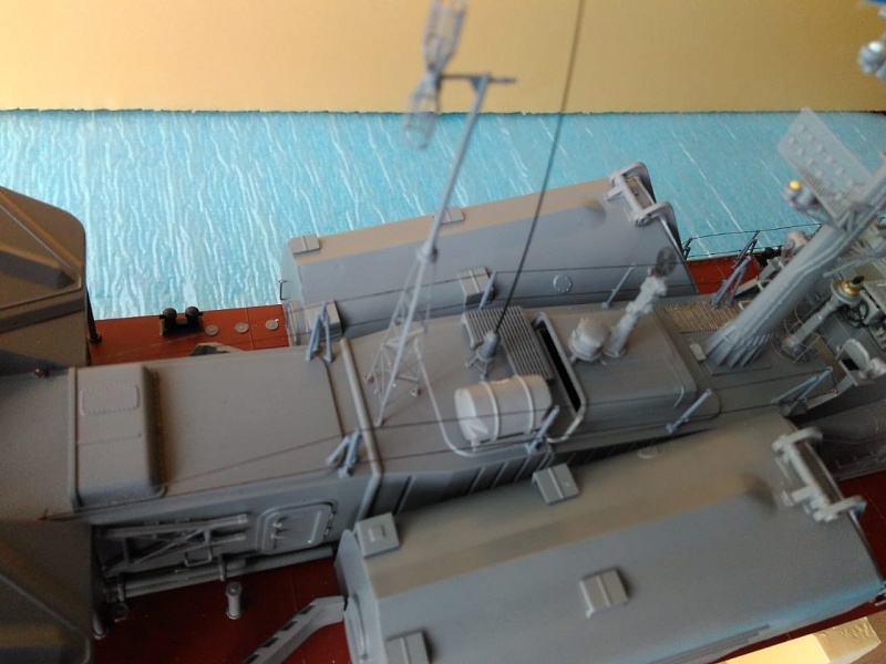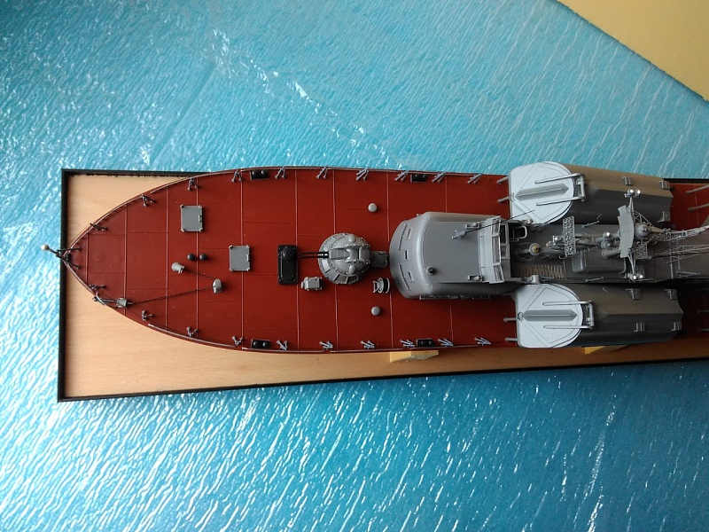 Номер исполнен декой. Ватерлиния - краска.НАЧИНКА; Два двигателя, коллекторные, по 60 Вт. Два регулятора хода. Два винта. Два руля. Центральные винт и руль съемные. Рулевая машинка. Винты "AMATI" , перепиленные. Дейдвуды - Латунь. Валы - ОВС.  Аккамулятор  Li Po  2200 mAh. Аппаратура пятиканальная, FLYSKY. Позволяет делать программные настройки характеристик. На этой модели установлено ограничение мощности  "назад" 15%, "вперед" 60% и ограничен угол отклонения руля  по 50* от положения "нейтраль".Вроде все. Фото и Видео к Вашему вниманию. С Уважением,