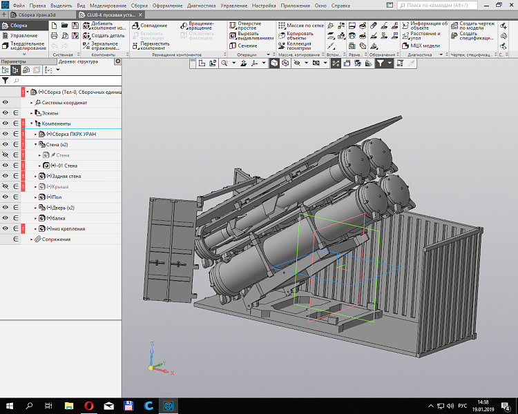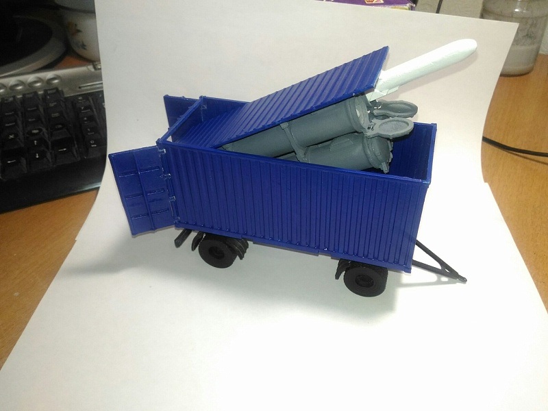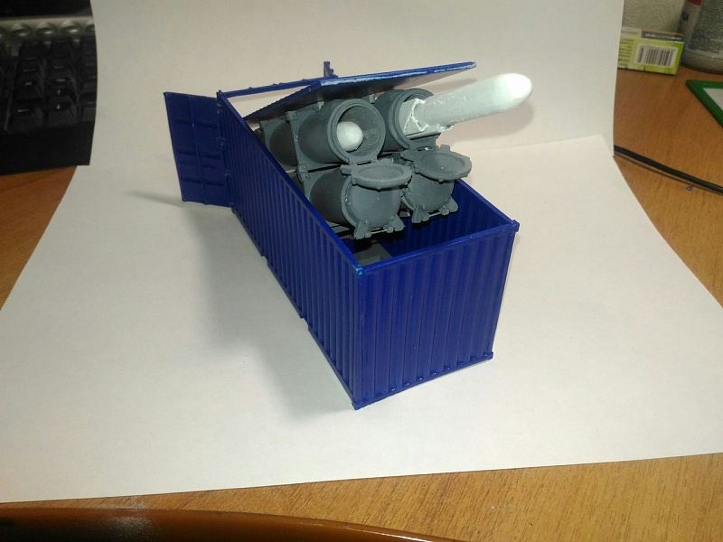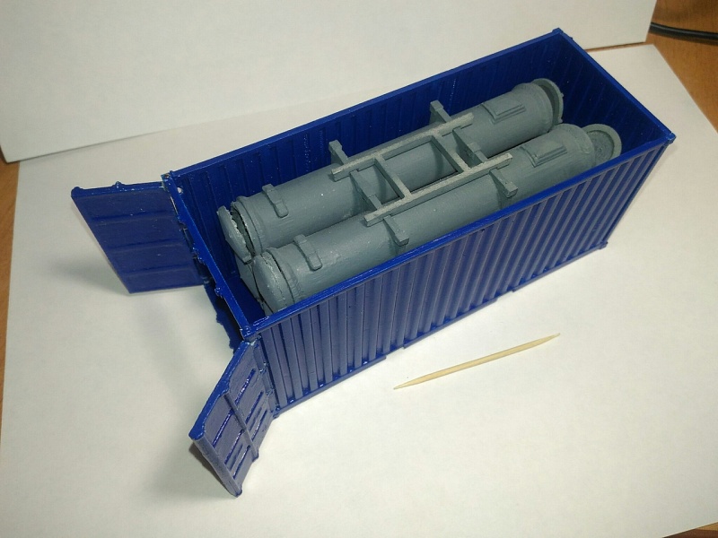 | Смоделировал в Компасе 3D V17 Home. Напечатал на китайском принтере Anet A6 с минимальными доработками, материал ABS. Модель состоит из 20 футового контейнера, ПКРК Уран(с трудом нашел эскиз) и противокорабельной ракеты Х-35. |