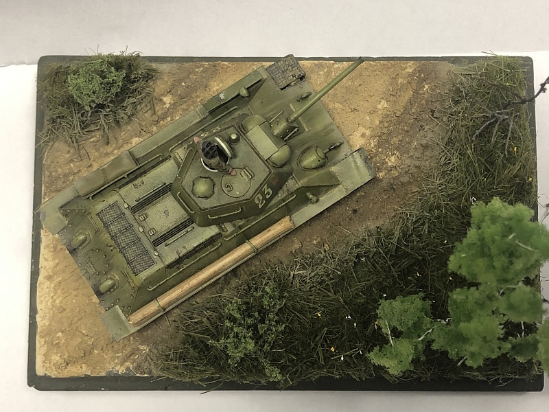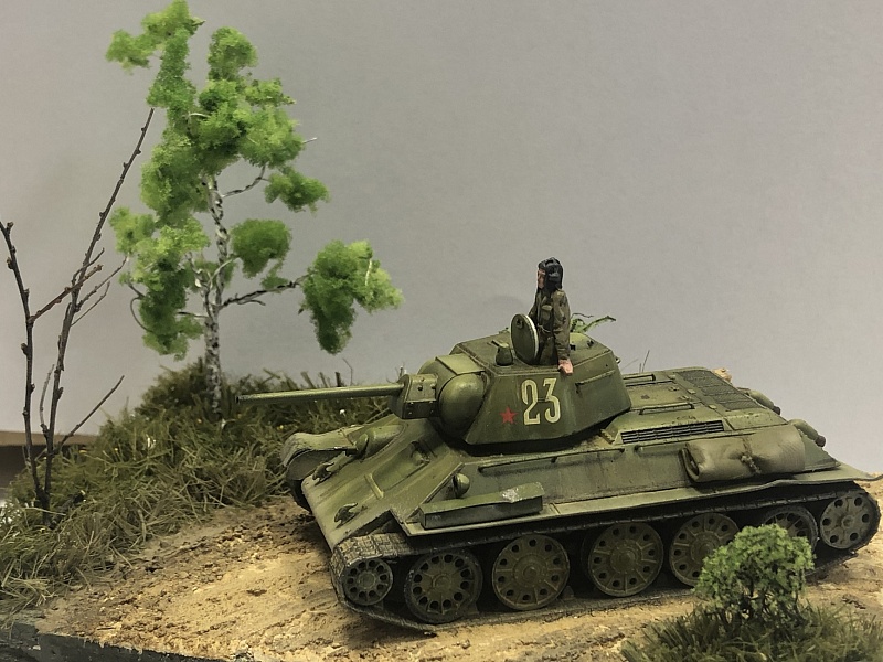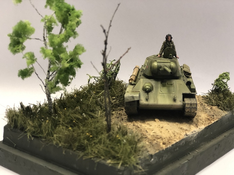 | Всем привет! Это моя первая публикация на Каропке.ру и третья диорама по счету. Начал собирать модели и учиться красить летом 2017. Через полгода начал тонировать и пробовать делать диорамы. Конкретно по этой работе: Т-34-76 образца 1943 года от Звезды.Конкретно эта тридцатьчетверка у Звезды в 72-ом масштабе очень технологичная и детальная. Собрал за полчаса. Далее сделал конверсию:- надгусеничные полки и ящик для инструмента из медной фольги. - скобы-поручни из проволоки.- крепление бревна самовытаскивания из проволоки,- скатка брезента из двухкомпонентной шпатлевки от TAMIYA. Окраска с цветомодуляцией: Акрил и полуматовый лак от TAMIYA. Ойлбрашеры и смывки от AMMO Mig. Командир танка от Orion. Пришлось повозиться с облоем, дели лица и пальцы на руках вырезать не стал. Окраска: Акрил и матовый лак от TAMIYA. Основа диорамы - ДСП, покрытая шпатлевкой по дереву и самодельной фактурной массой. Все пигменты самодельные, сделанные из природных грунтов просеянных через мелкую сетку от водопроводного фильтра. Трава - лен сантехнический, покрашенный красками от ЗВЕЗДЫ. Береза - выполнена из проволоки, местами, если присмотреться, проглядывается "проволочная топология ветвей". Листва - губка, пропитанная краской и измельченная на терке. Сухое дерево - засушенная ветвь черничника. Композиция закрыта стеклянным колпаком, препятствующая запылению. Большое спасибо Андрею Кайзеру за фото-сессию. Всем приятного просмотра, буду рад критики по существу и комментариев. |