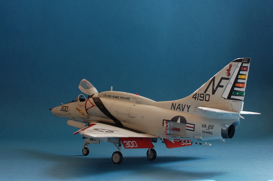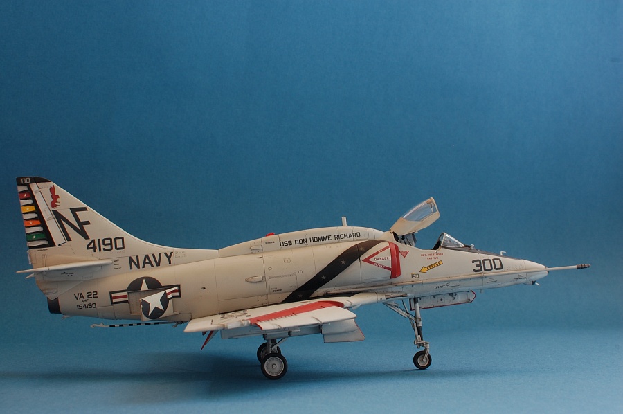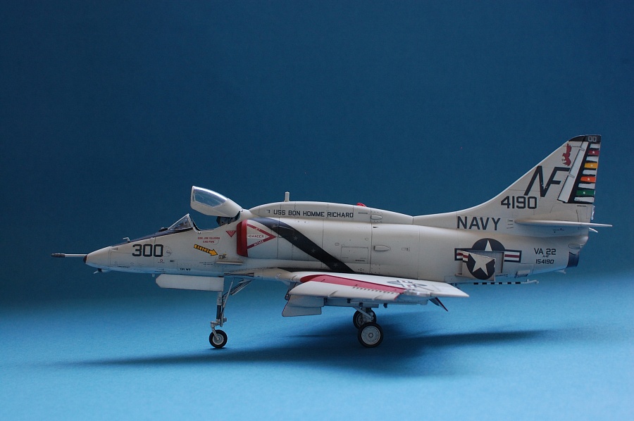 | Здравствуйте, уважаемые моделисты. Представляю вашему вниманию свой Скайхок, собранный давно, лет 8-9 назад. Я не очень большой любитель реактивных самолетов, но этот горбатый уродец все же привлек внимание. Глядя на него понимаешь, откуда Джордж Лукас черпал вдохновение, создавая образы звездолетов для своих "Звездных войн". Я ленивый моделист и всегда предпочитаю наборы с хорошей собираемостью. Этот один из ярких примеров. На щелчок. Красил аэрозольным баллонами Тамия. Пачканинг по минимуму пастельными мелками. Спасибо за внимание. ) |
