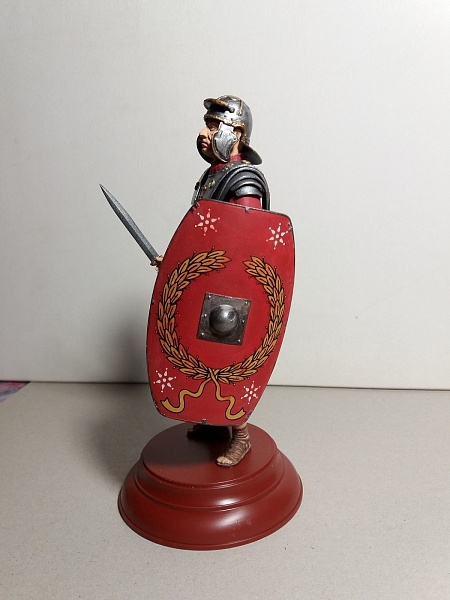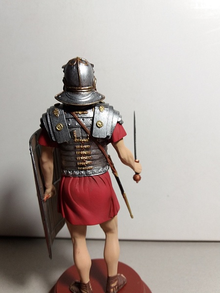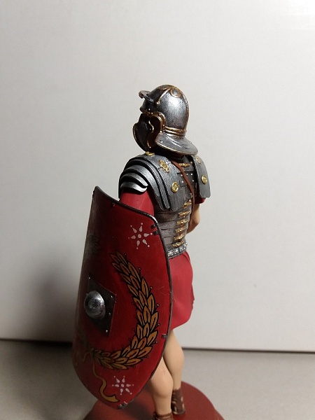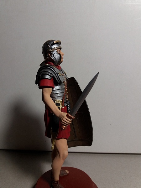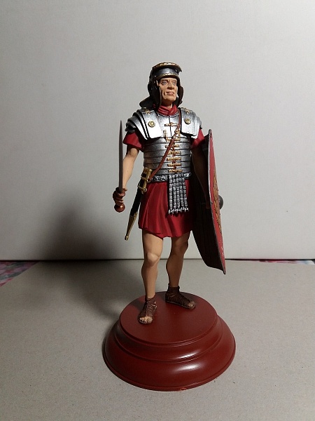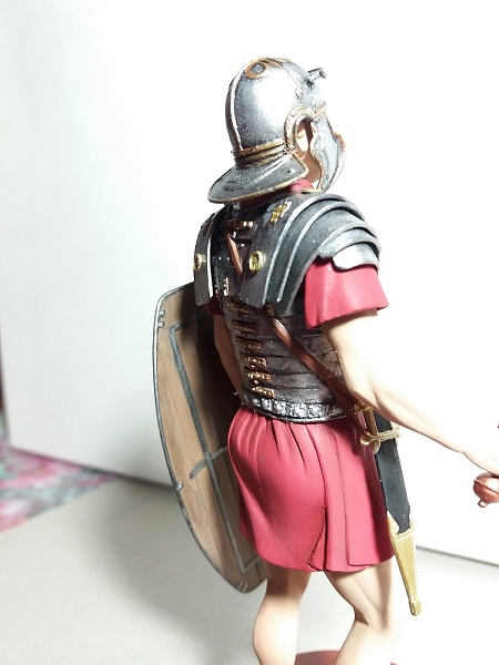 Если это римский легионер- то пурпур для него - слишком дорог. Применяйте более "природные" цвета- серый, зеленоватый, коричневый, бежевый. Понятно на бокс арте всё красиво, а вот историки- другого мнения.