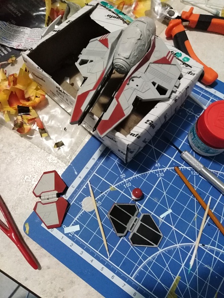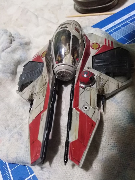| Eta-2 Actis - перехватчик Республики времен Войн Клонов, дальнейшее развитие звездолета Delta-7. Несет 2 лазерные и 2 ионные пушки, не имеет гипердивигателя и для дальних путешествий пользуется разгонными кольцами, как и его предшественник, однако он гораздо более маневренный и быстрый. Имеет складные радиаторы, сходные с TIE-истребителями. Позднее также был на вооружении Галактической Империи. Перехватчики, на которых летали джедаи, модифицировались так, чтобы стать ещё быстрее. С них снимали тяжёлые сенсоры и приборы управления, потому что они не нужны тем, кто обладает способностями, дарованными Силой. Большинство джедаев летало на перехватчиках стандартной расцветки (например, Оби-Ван Кеноби) – красной или синей на белой основе, но некоторые раскрашивали свои машины в необычные цвета. Модель, насколько я знаю, выпускает только Revell: в варианте Энакина и Оби-Вана, я решил собрать второй. Масштаб 1:58, в фильтре пришлось указать 1:72. Деталей немного, что наверное минус, потому что некоторые вещи было бы проще красить отдельно. В целом набор мне понравился. Красил под "ушатанный" вариант, каким он был в 3 эпизоде во время битвы над Корусантом.  |