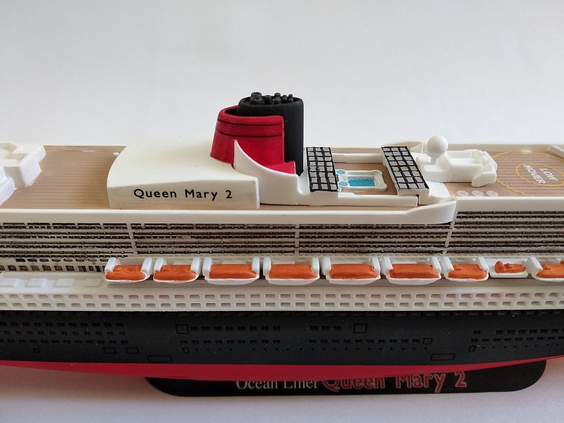 | Доброго времени суток. Представляю модель круизного лайнера Queen Mary 2 от Revell. О корабле. Киль был заложен в 2002 году на верфи в Сен-Назере. На воду спущен в 2003 году, введен в эксплуатацию в 2004 году. Осуществляет как трансатлантические переходы на линии Саутгемптон-Нью-Йорк, так и круизы. Свое название носит в честь королевы Марии Текской (бабушка Елизаветы Второй), супруги короля Георга Пятого. Основные ТТХ:- длина: 345 м.;- ширина: 41 м.;- высота: 72 м.;- осадка: 10 м.;- водоизмещение: 79 287 т.;- двигатели: 2 парогазовые турбины, 4 электродвигателя;- скорость хода: 30 узлов;- экипаж: 1 200 человек;- пассажировместимость: 2 600 человек. О модели. Модель небольшая, длина готовой модели 29 см. В наборе 45 деталей из белого пластика. Облоя замечено не было, следы толкателей с обратной стороны деталей. Масштаб некоторых деталей вызывает сомнение, т.к. они кажутся слишком толстыми. Корпус выполнен одной деталью.Корпус и палубы красил аэрографом, мелкие детали (шлюпки, винты, трубу) красил кистью. Краски матовые: Tamiya, Звезда. Черные окна на мостике - это декаль, которая шла в наборе. Остальные иллюминаторы выделял черной смывкой от Tamiya.Из недоделок:- лобовая часть надстройки не примыкает к палубе. Заметил, когда начал стыковать.- некоторые элементы на верхней палубе не плотно к ней примыкают, есть щели.Хотел попробовать нанести смывку на палубу, но побоялся испортить. |