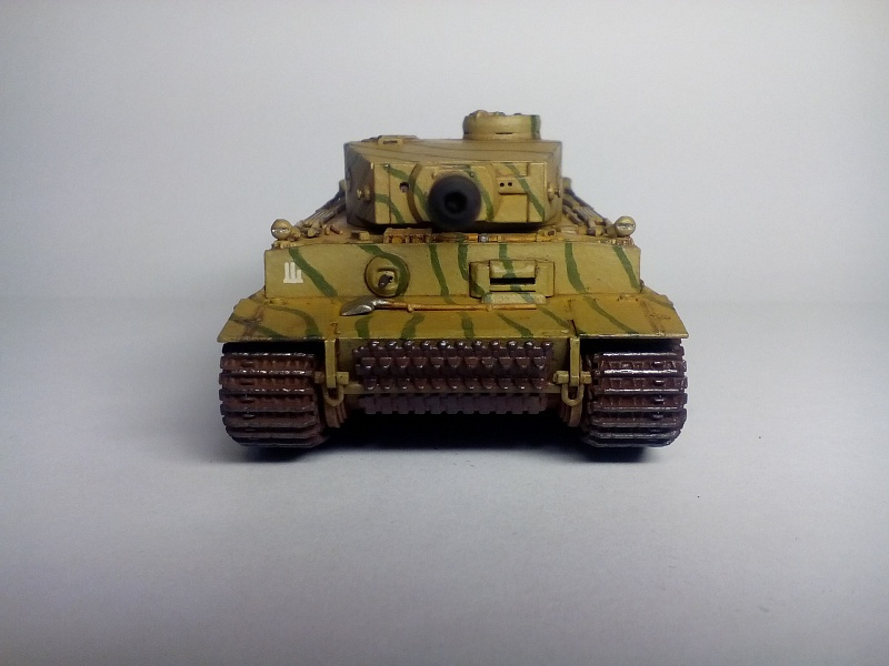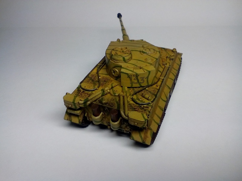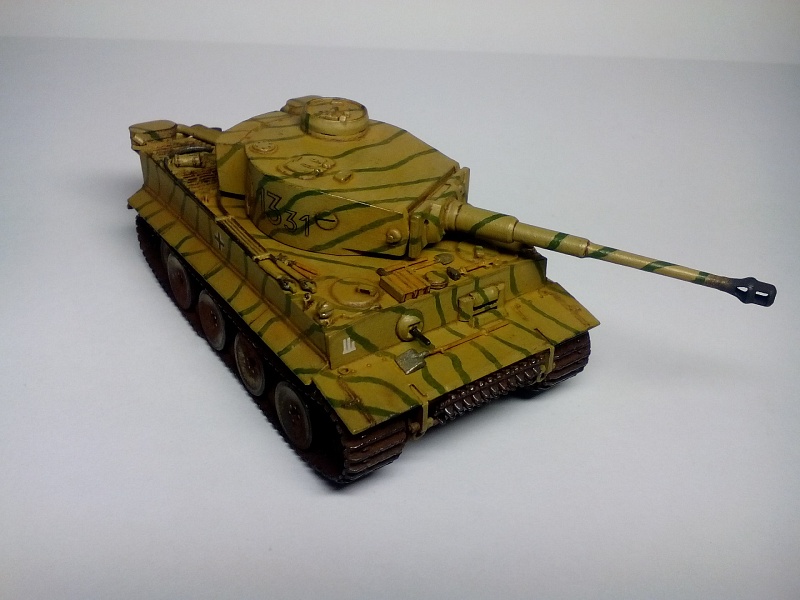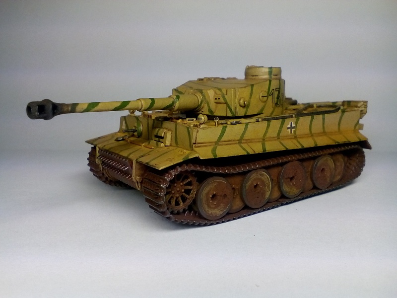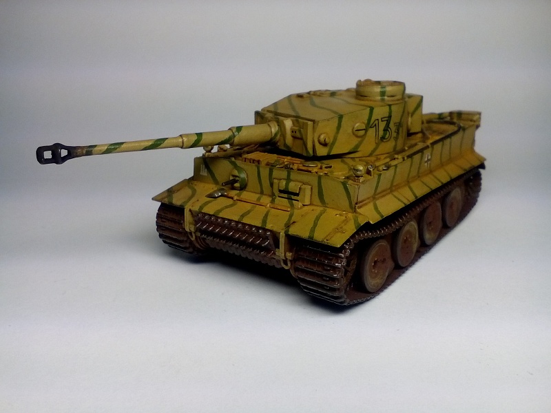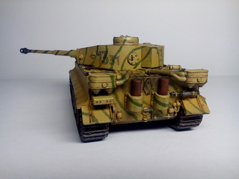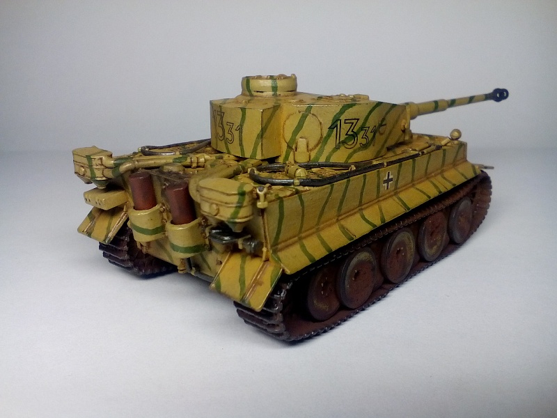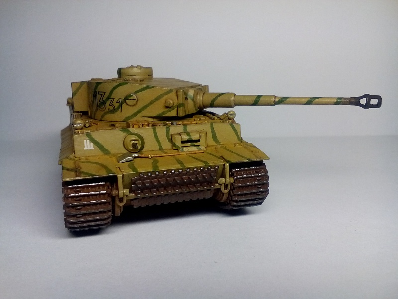 | Здравствуйте друзья! Представляю Вашему вниманию свою третью собранную модель. Модель покрыта грунтом Хо-Ма. Далее, корпус был окрашен в светло-песочный цвет той же фирмы (так как изначально была задумка сделать Тигр, воевавший в пустыне). Цвет мне не понравился, и далее - было решено окрасить модель по инструкции красками Звезда. В итоге поверх первого слоя краски, был нанесен базовый цвет от Звезды. После, были прорисованы зеленые полосы. Изначально пытался повторить рисунок камуфляжа с инструкции, но понял что двух картинок для этого недостаточно. В итоге - полос вышло гораздо больше и они тоньше. В целом - выглядит довольно хорошо. Также краской цвета резины фирмы Хо-Ма были окрашены бандажи опорных катков и черной краской были выделены оптика, противопехотные гранатометы на корпусе, смотровые щели и бойница в башне. Также серебристым выделил отражатели фар. Гусеницы окрашивались то в оружейную сталь то ржавчину от Хо-Мы. Далее - места под декали были покрыты глянцевым лаком Хо-Ма, после чего нанесены сами декали. После поклейки декалей, модель покрывалась глянцевым лаком для нанесения коричневой смывки, также от Хо-Мы. Так как смывку в принципе применял в первый раз, наносил её довольно много, с расчетом удалить лишнюю ватной палочкой смоченной в Уайт-спирите. В итоге - после проведенных манипуляций краска успешно слезала до самого грунта а лак брался трещинами. Возможно, если бы не сильно вытирал - краска бы осталась, но трещин лака вряд ли бы удалось избежать. Благо что делал всё вышеперечисленное хотя бы только на башне(лучше бы попробовал на днище корпуса). В итоге - поверх всего этого добра(кроме мест с декалями) башня была покрашена заново и заново нанесены зеленые полосы. После этого случая - смывку вытирал исключительно сухой ватной палочкой либо диском, еще помогают зубочистки. Получается очень хорошо, если не наносить очень много смывки. После смывки, модель была покрыта уже матовым лаком всё той же горячелюбимой Хо-Мы. После модель состаривалась пигментами, угадайте от кого?) - Правильно, от Хо-Мы). Использовались следующие пигменты: Сажа(дульный тормоз и выхлоп), украинский чернозем(ходовая часть) и светлая песчаная пыль либо светлая земля(корпус и башня, для эффекта запыленности). Кстати, с помощью чернозема - удалось сделать обьемные куски засохшей грязи на катках и днище корпуса(да, его я не сфотографировал), что придает модели реализма. Для этого поочередно наносил пигмент и фиксатор несколько раз(в следующий раз - хочу попробовать использовать для создания обьема шпатлевку). Еще была окрашена внутренняя часть дульного тормоза черным цветом, так как зачернить его внутри пигментом без фиксатора - было не реально. Больше фиксатор нигде не применялся. Еще был применен простой карандаш(им наведены опорные поверхности траков гусениц, зубья ведущего колеса и кромки на башне и ком. башенке. Собственно на этом всё. Кстати, шанцевый инструмент и троса - были окрашены и приклеены на корпус до нанесения камуфляжа, что было большой ошибкой, так как я предпочитаю детали, особенно мелкие, окрашивать отдельно до приклеивания, дабы было удобнее полностью их прокрасить. Поэтому, приходилось их подкрашивать и на корпусе. Поэтому - нужно тщательнее продумывать свои действия при сборке и окраске. Всё покрыто/окрашено кистью. Буду рад В
