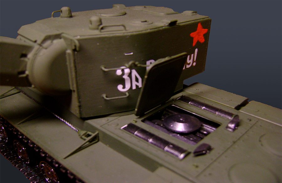 | Доброго времени суток! Представляю советский тяжёлый танк - КВ-2.Производитель - "Звезда", масштаб 1:35 Вторая модель, которую я собрал в своей жизни, первой была - Pz.Kp.Fw V "Panther" и то лет 8 назад. Как неискушенный моделист, я не имею хорошего представления о том, как придать машине историчный или более-менее реалистичный вид. Таким образом я выбрал для себя стиль танка-памятника, как часто встречаются на постаментах в городах. К сожалению, фару я трагически потерял при определенных обстоятельствах :D В силу довольно неоднозначного способа крепления, люди на корпусе намертво задраены, башенные люди рабочие. В покраске все предельно незатейливо: 1) Корпус окрашен акриловой краской защитного цвета (№55); 2) Гусеницы, катки и части, которые задумывались как чёрные - воронёная сталь (№08), так как при нанесении более чем 1 слоя она становится достаточно темной. 3) Интерьер, которого почти не видно, белый акрил (№17). Звезду не получилось нарисовать аккуратно, да и декали в коробке такой почему-то не было, мб в будущем исправлю. По итогу, приятное времяпрепровождение и эстетическое удовольствие сборка данной бронемашины принесла сполна. Надумываю собрать еще одну, пока выбор падает на Pz.Kp.Fw VI "Tiger" |