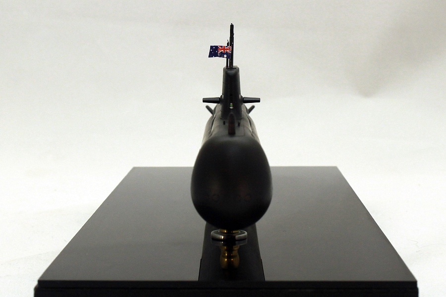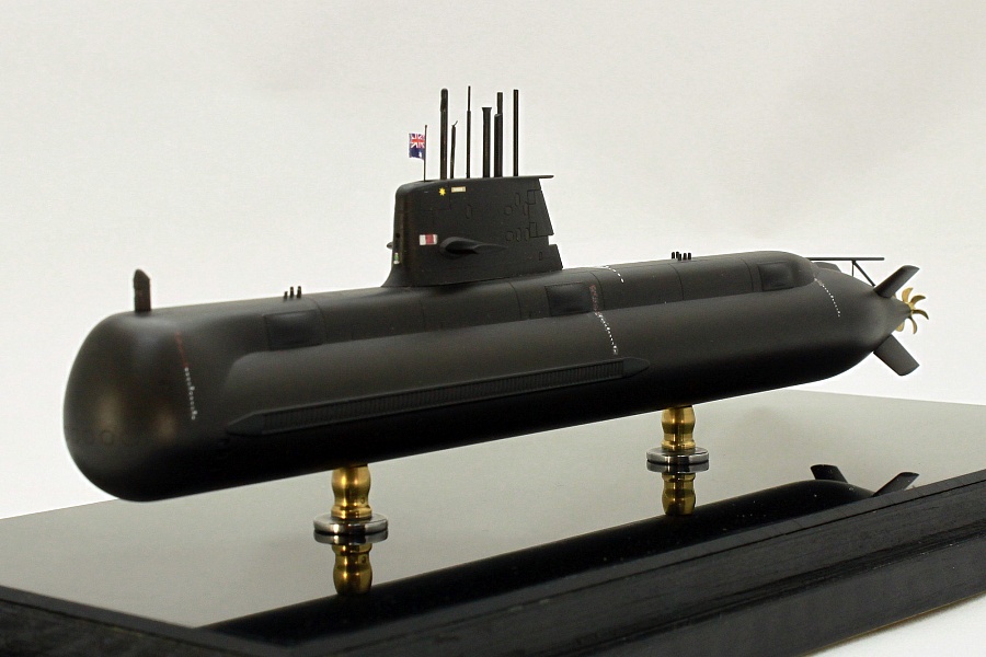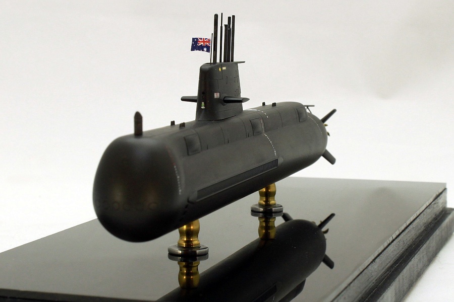 Представляю свою очередную модель подводной лодки, на этот раз австралийской HMAS Sheean (SSG 77), пятой в серии из шести единиц. Прототип Названа в честь рядового матроса флота Австралии Эдварда Шина, героя Второй Мировой войны, награжденного Крестом Виктории для Австралии Заложена 17 февраля 1994 Спущена 1 мая 1999 Введена в строй 23 февраля 2001 Участвовала в RIMPAC 02, где ей удалось проникнуть сквозь защитный ордер десантной группы из восьми кораблей, а затем успешно атаковать десантный корабль USS Tarawa и десантный корабль USS Rushmore. В 2006 году "Шину" был вручен Кубок Глостера за то, что он является кораблем с наибольшей общей эффективностью за последние двенадцать месяцев. ТТХ: Длина 77,4 м; Ширина 7,8 м; Осадка 7 м Водоизмещение: 3051 т надводное; 3353 т подводное Силовая установка: 3 18-ти цилиндровых дизеля мощностью 6020 л.с., 2 генератора мощостью 4,2 МВт, 1 электродвигатель мощьностью7344 л.с. Скорость надводная 10,5 уз, подводная 21 уз. Дальность хода: надводная 9000 миль/10 уз, подводная 33 мили/21 уз, или 480 миль/4 уз Глубина погружения: 180 м Вооружение: 6х533-мм ТА, боезапас 22 торпеды, ракеты или 44 мины Экипаж: 42 человека Субмарины типа «Коллинз» в свое время были крупнейшими неатомными субмаринами. Модель Данная модель строилась мной из набора от Showcase Models Модель пластиковая. На порядок лучше набора от OKB Grigorov Набор снабжен декалями на всю линейку "Коллинзов", собственно из-за этого я его и приобрел по случаю. Немного озадачила рубка из прозрачного пластика, из-за этого я упустил из виду утяжину в ее задней части. Добавил навигационные огни в рубке, получилось ярковато. Добавил флаг из декалей, заказанных у Григория Сушкова, поскольку родной пошел на "Коллинз". Часть ВУ заменил на металлические из медицинских иголок., Также из иглы выполнил трубу выпуска гибкой антенны. Декали марок заглубления местами засеребрились, но это мой косяк, поторопился с нанесением лака, не обработал как следует жидкостями для декалей. |