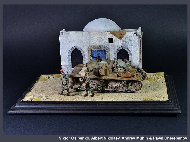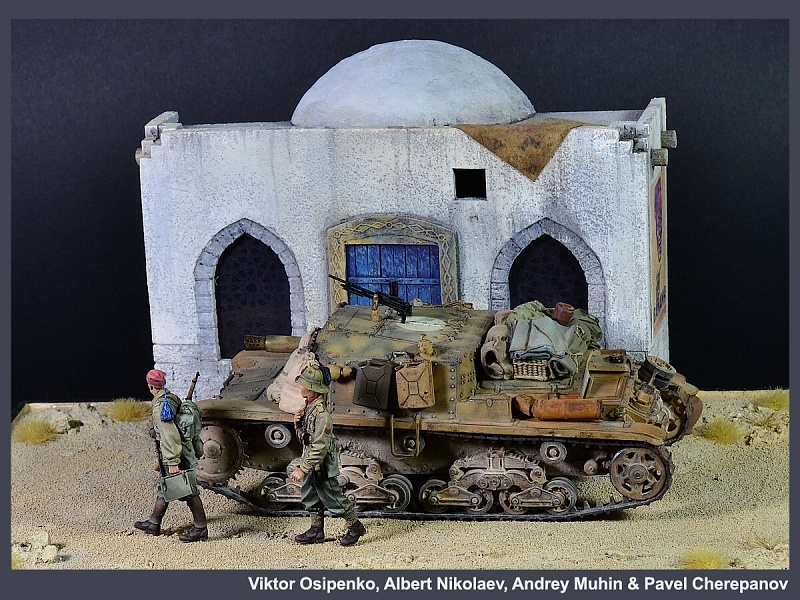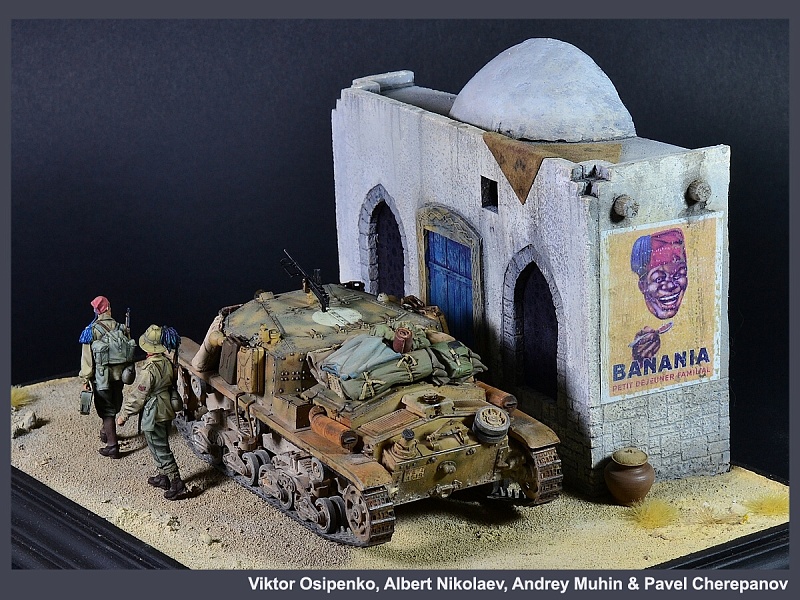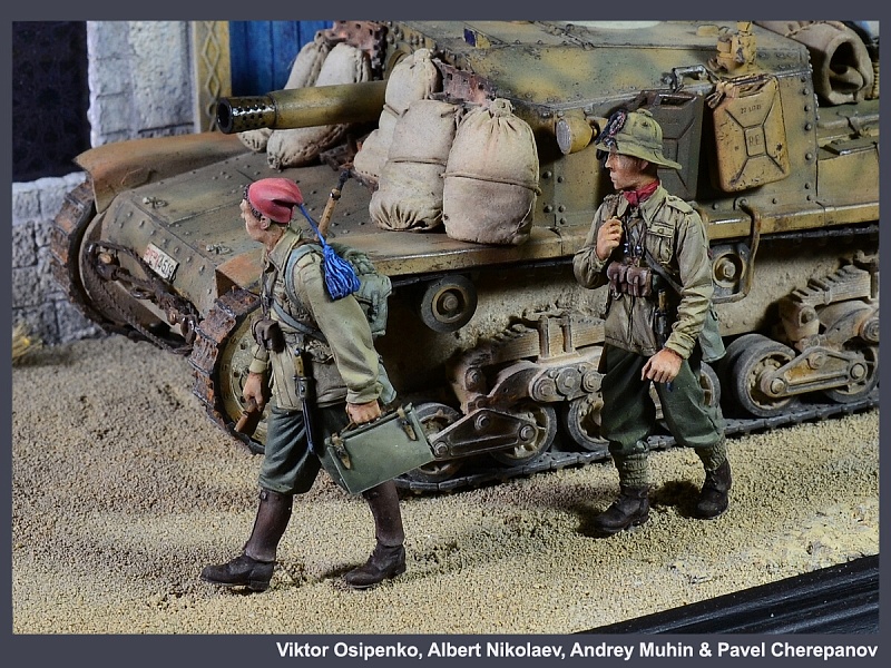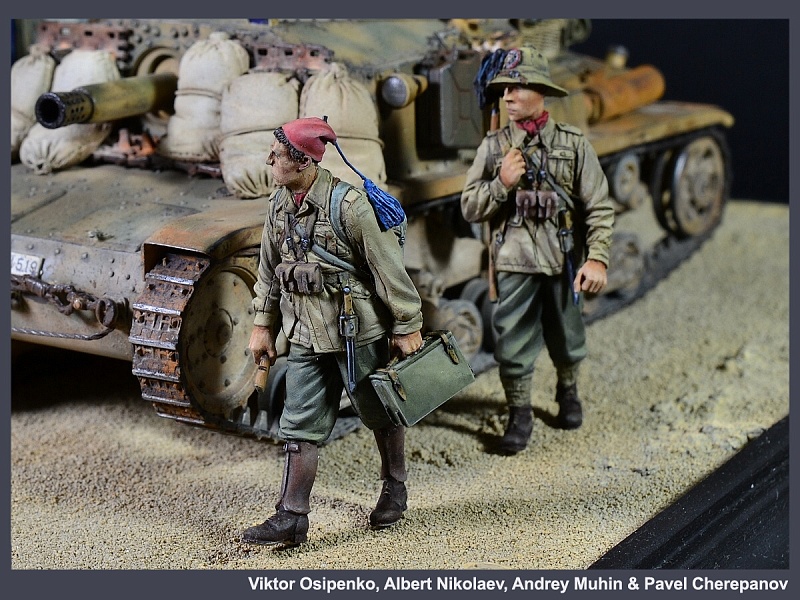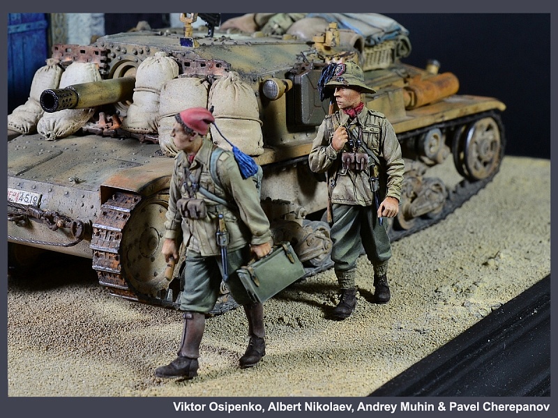 | Совместная работа четырех моделистов, Андрея Мухина, Виктора Осипенко, Альберта Николаева и Павла Черепанова. Работа построена на продажу! ИСТОРИЯ Берсальеры - элитные части итальянской армии, ведут свою историю с 1836 года, когда Королевство Сардинии и Пьемонта, испытывая нехватку дорогой кавалерии, создало, по настоянию генерала Алессандро Ла Мармора, корпус отборных легковооруженных стрелков. Эти части знамениты высокой мобильностью (с начала 20 века они использовали велосипеды, затем мотоциклы, и наконец БТРы), меткой стрельбой, развитой личной инициативой. Первоначально их использовали в качестве иррегулярной пехоты, как егерей в Русской Императорской армии, но они могли применяться и как штурмовые отряды. Первой известной битвой их был штурм моста Гойто во время Первой войны за объеденение Италии. Затем - знаменитая битва у Черной Речки, под Севастополем, во время Крымской войны, после которой восхищенные их храбростью французские зуавы (арабы) подарили им своим красные фески с синими кисточками. В честь той битвы один из батальонов берсальеров и сегодня носит наименование "Cernaia". Они сыграли важную роль во Второй войне за Объединение Италии, в 1870 году, когда 12й батальон берсальеров возглавил штурм Рима через пролом в крепостной стене, что и привело к окончанию войны. В честь этого берсальерам в Риме воздвигнут памятник. В тот период имелось уже 10 полков берсальеров, 40 батальонов. А в Первую мировую - уже 21 полк, причем из 120 000 берсальеров 32 000 были убиты и 50 000 ранены (Бенито Муссолини был среди них, получил ранение). Помимо Итальянского фронта они воевали и в Палестине, где прославились во время обороны Иерусалима. Элитные части, с отличной боевой подготовкой, высоким моральным духом, агрессивным настроем, берсальеры в 30-х годах были приданы каждой танковой и моторизованный дивизии (по одному полку). Во Второй Мировой войне участвовали все 12 имевшихся к ее началу полков (по три батальона) + еще один, 18й. В течение всей войны берсальеры не "разбавлялись", а продолжали комплектоваться отборными, самыми высокими и крепкими рекрутами, с лучшими показателями меткости и проходили наиболее интенсивный курс подготовки. Воевали на юге Франции, в Греции, Восточной Африке, в Северной Африке. И конечно на Восточном фронте (практически уничтожены под Сталинградом). В 1943 году после высадки союзников в Италию и свержения Муссолини, страна разделилась, и остатки батальонов берсальеров сражались по обе стороны фронта... В 1945 году были планы распустить берсальеров полностью, но они благополучно существуют до сих пор, как цвет и гордость армии Италии, участвуют в миротворческих операциях (Ливия, Сомали, экс-Югославия), в войне в Ираке и Афганистане. Сейчас осталось шесть полков берсальеров, которые чтут все свои традиции, включая отличительные черные широкополые шляпы ("вайра") с плюмажем из черных перьев, фески, черные перчатки, красные петлицы мундиров. На параде они всегда двигаются пробежкой, включая оркестр, играющей марш Flik Flok на бегу. Кстати, плюмаж из перьев они носят даже на своих нынешних НАТОвских касках (изначально эти перья служили защитой для шеи от сабельного удара) ФИГУРЫ фирмы Alarmi! окрашивал мой друг Виктор Осипенко, ДИОРАМНОЕ ОСНОВАНИЕ выполнил Альберт Николаев, а сам танк - слегка доработанная мной модель Андрея Мухина. В целом, 