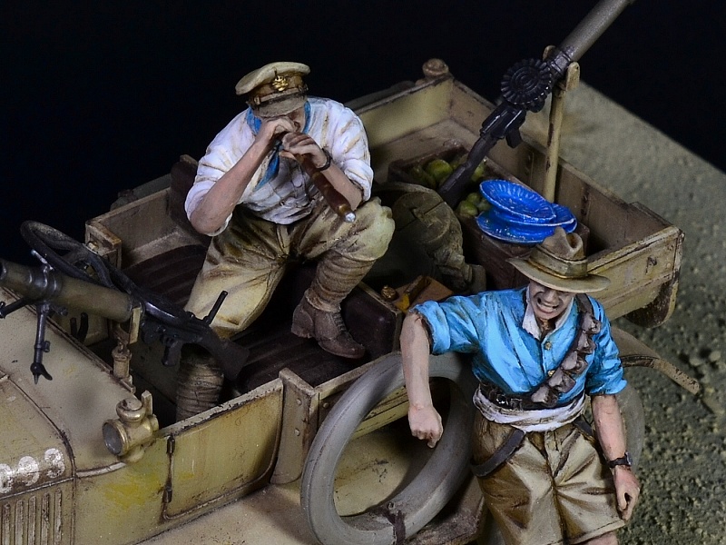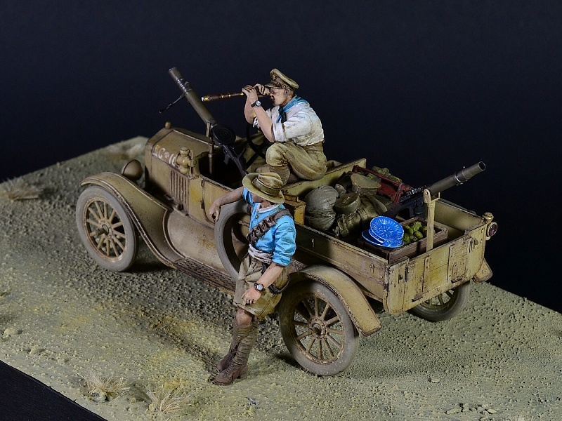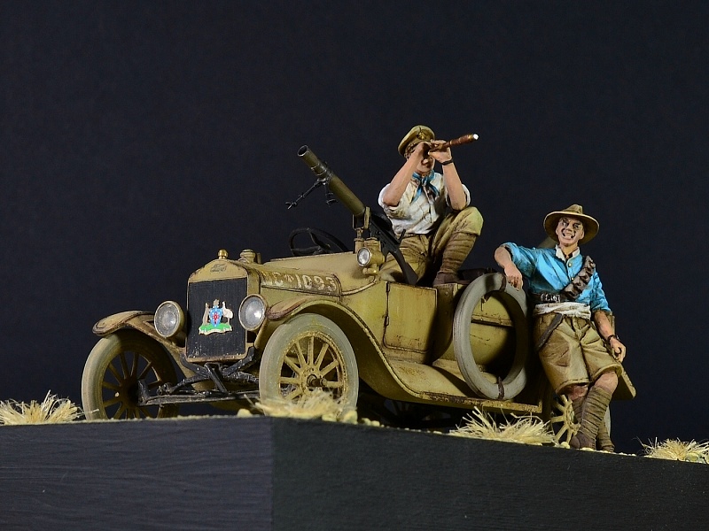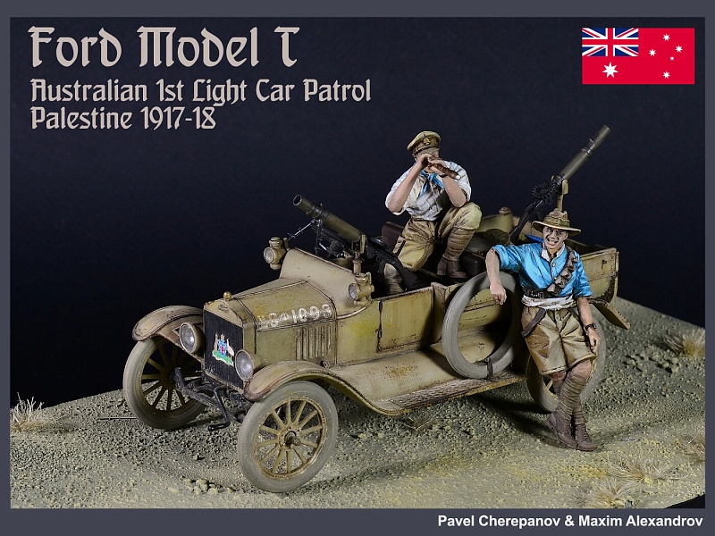 | Новая работа Павла Черепанова, "Форд Т" австралийского патруля в Палестине, Первая Мировая. Масштаб 1:35. Роспись фигур - Максим Александров. Работа выполнена на заказ. ИСТОРИЯ Австралия отправила на фронты Первой Мировой войны более 300 тысяч солдат, исключительно добровольцев, которые проявили себя отчаянно смелыми и не самыми дисциплинированными бойцами. Из низ более 60 тысяч человек погибло, это были самые высокие потери относительно численности населения, среди всех стран-участниц 1МВ. В 1915 году австралийско-новозеландский корпус ANZAC был высажен на Галлиполи, где в ходе затяжной и кровавой битвы Австралия потеряла больше 8000 человек только убитыми. После эвакуации австралийские дивизии были отправлены в Египет, где их кавалерия активно участвовала в Синайско-Палестинской операции, сражаясь против турок, а также подавляя восстания в Судане и Египте. На Западном фронте австралийцы участвовали во многих крупных сражениях, при Ипре, на Сомме, при Пашендейле и именно там понесли основные потери. Участие в Первой Мировой стало предметом национальной гордости в Австралии, легенды ANZAC, по сути, сформировали характер этой нации. Во Вторую Мировую семимиллионная страна отправила на фронт более 600 000 солдат, и в сражениях в Бирме, Папуа-Новой Гвинее, Северной Африке, в Греции и на Крите, в Италии и во Франции, австралийцы снова показали свой высокий боевой дух. Внеся огромный вклад в войну ради британских интересов, Австралия добилась независимости от метрополии. Мало кто знает, что австралийцы принимали активное участие и в войне в Корее, во Вьетнаме, в контрпартизанских операциях в Малайзии и Индонезии в 60-70 годах, в операции Буря в Пустыне, и в последующих войнах в Ираке и Афганистане. Но мы отвлеклись. В Синайско-Палестинской кампании 1915-18 годов австралийцы сыграли заметную роль, особенно две кавалерийских дивизии. Самым ярким эпизодом была конная атака австралийской 4-й легкой бригады в битве при Беэр-Шева 31 октября 1917 года. Также в боях в Палестине, Египте и Судане участвовал небольшой моторизованный отряд, 1st Armoured Car Section, в составе трех бронеавтомобилей, Daimler, Mercedes и Minerva. Этот отряд был сформирован в Мельбурне в 1916 году, где в Южном Мельбурне на фабрике Vulcan Engineering Works три машины были переоборудованы в бронеавтомобили и вооружены пулеметами "Кольт". Отряд подавлял восстание секты Сенусси в Судане и в Западной Пустыне в Ливии. В декабре 1916 года отряд был переименован в 1st Light Car Patrol, изношенные и не подлежащие ремонту бронемашины пришлось сменить на шесть легковых автомобилей Ford Model T, вооруженные пулеметами "Льюис". (Более поздние Форды отличались закругленной формой капота). Также отряд получил мотоциклы. Шесть машин имели собственные имена: Anzac, Billzac, Osatal, Silent Sue, Imshi и Bung. В декабре 1917 года их поменяли на шесть новых Фордов Model T 1917 LCP. В мае 1917 года по железной дороге отряд был переброшен в Палестину, где и воевал до конца войны против Турции. Отряд выполнял функции разведки дальнего действия и патрулирования, зачастую вдалеке от основных сил союзников. В конце кампании 1918 их машины добрались аж до самого Алеппо в Сирии, дальше чем любые союзные части. Скорее всего окраска машин Model T 1917 LCP была изначально цвета хаки, с черной рамой и радиатором, и австралийцы перекрасили их в песочный цвет уже на месте. Вооружение было - пулеметы Vickers и Lewis калибра 