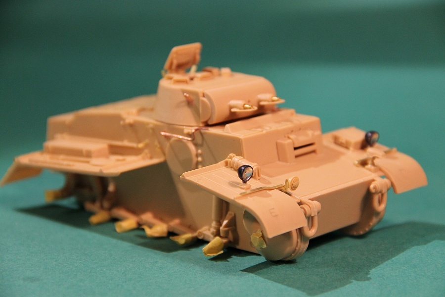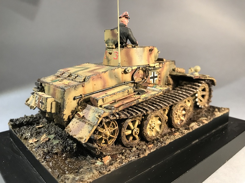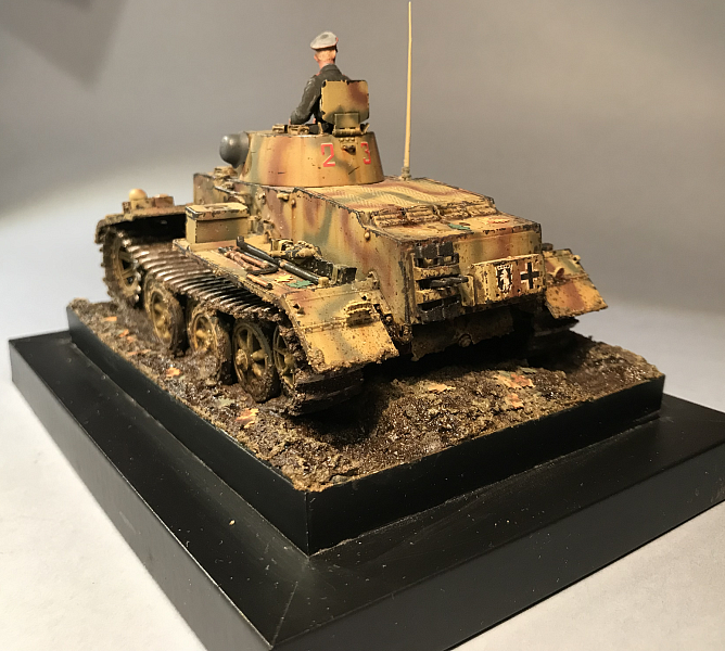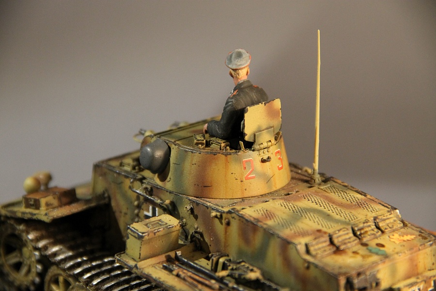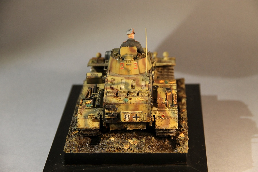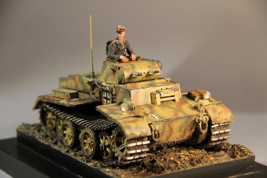 Модель из коробки. Из дополнений: стволы пулеметов – RB; траки – Friulmodel; фары – Elf; трос – Eureka. Доработал выхлопную трубу – добавил кожух и установил полую металлическую трубку выхлопной трубы, люк на башне сделал открывающимся. Поручни – проволока. Фигурка – Tristar. Основание – фоторамка, скульптурный гипс и ZIPовская грязь. Окраска - акрил Tamiya и темпера. |