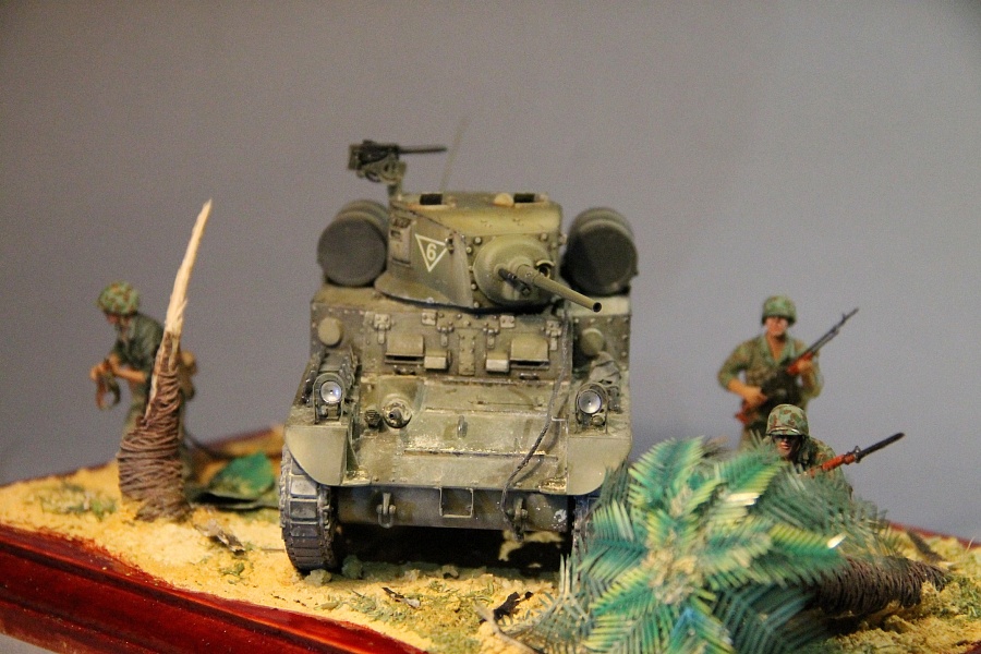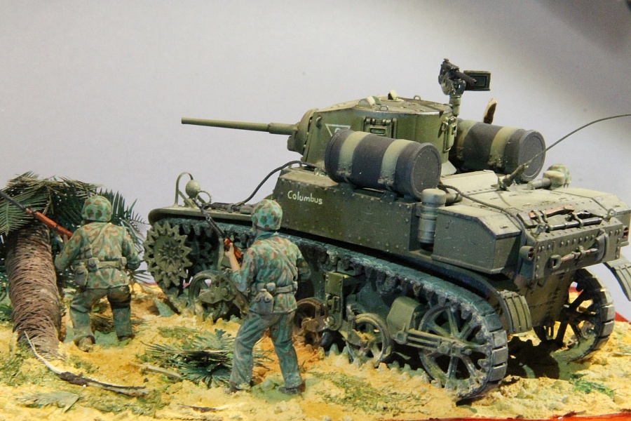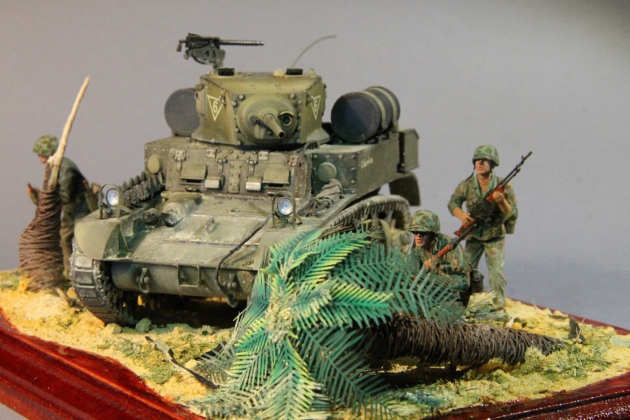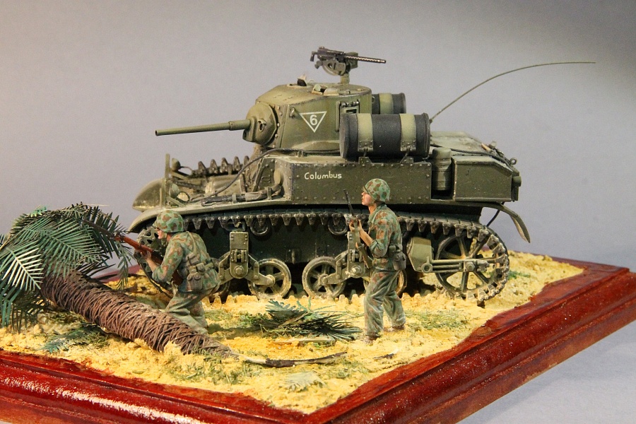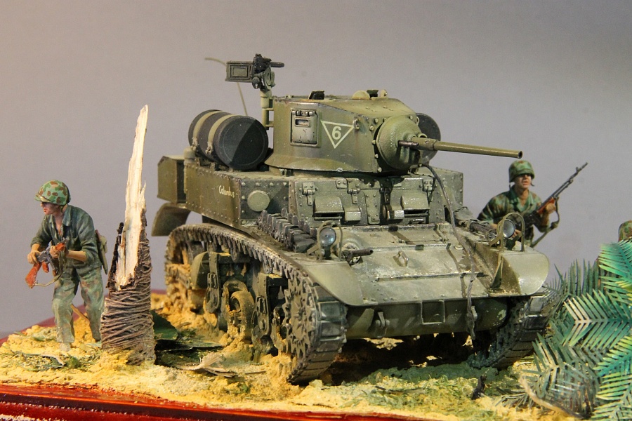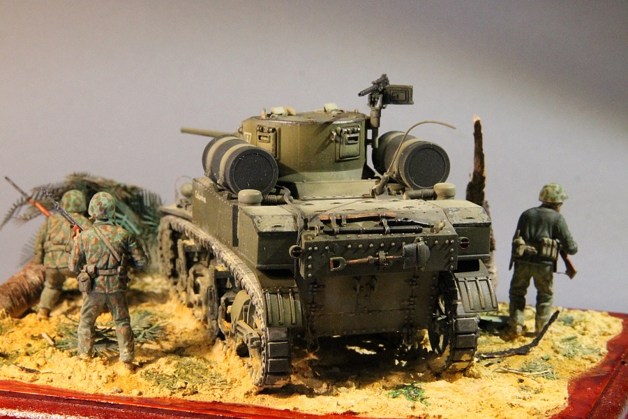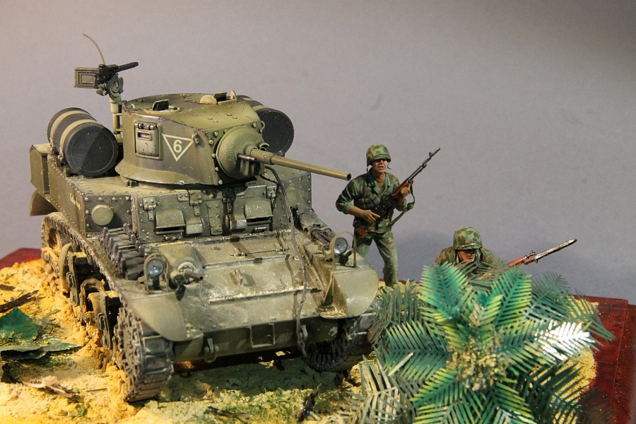 Из придиризмов только толстоватые кромки штыка и морпех у пальмы как-то неудобно держит винтовку. Гусеницы смотрятся эллипсообразно (как перетянутые виниловые), но посмотрел на фото реальных Стюартов - оказывается так и было в реале.