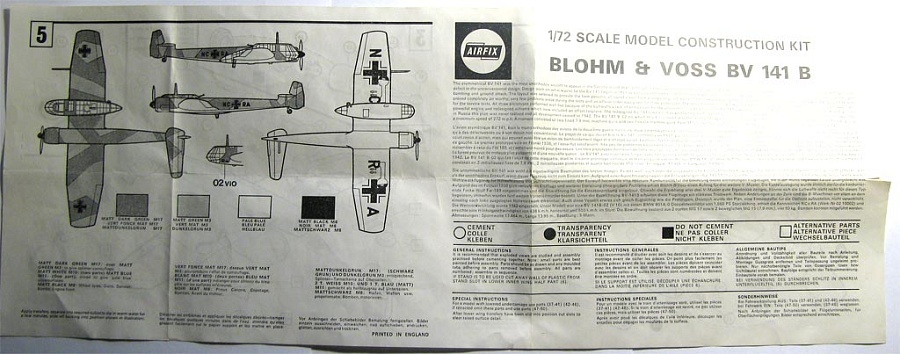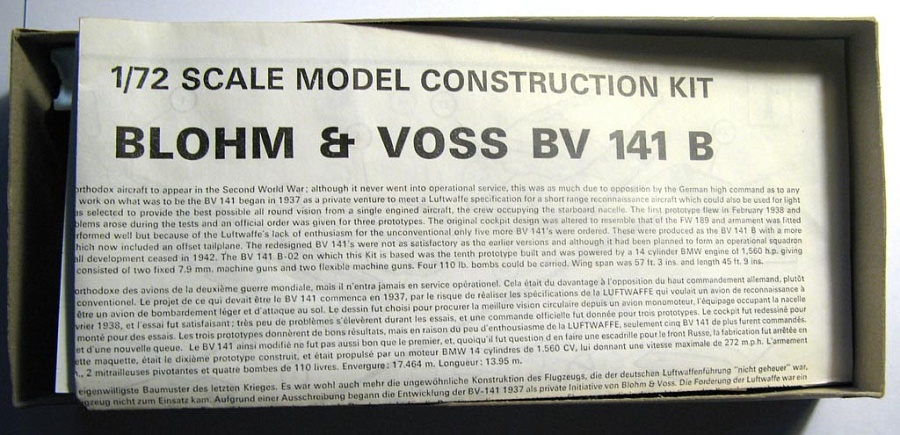 | Blohm&Voss BV141B Airfix 1/72 Производитель: Airfix маcштаб: 1:72 номер каталога: 394 Технология изготовления: ЛВД деталей: 60 Декаль: 1 вариант 1 NC+RA это 10и ферзух этого самолёта. Сама модель древний айрфикс 70хх годов с соотвествующей проработкой внутрянки, ниш, и легендарной огуречной клёпкой на фюзеляже...Модель в данном масштабе безальтернативна... В 48 HiPM выпускала 141... Модель перевыпущена фиксом в 2011г в красной коробке. Вобщем сам прототип очень забавная ассиметричная машинка. Хотя по некоторым сведениям выпущено 13 самолётов, и даже из них сформировали разведовательное подразделение на восточном фронте... говорят их видели на Украине. |