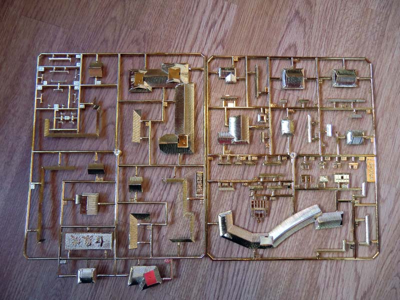 | Изделие японской фирмы Doyusha. Относится к серии «Великие замки Японии».  Масштаб 1:380. Также в ассортименте производителя есть замки в масштабе 1:540 и 1:800. Кроме японских замков, присутствует Нойшвайнштайн. Замки выпускаются в двух вариантах - обычный и G(old). У последних крыши покрыты золотой краской, что превращает модель в красивую игрушку. Но о исторической достоверности речи, конечно, совсем не идет. Все заказывалось по принципу «купи кота в мешке». Коробка приличного размера, больше, чем у танка в 35 масштабе. В наборе основание, состоящее из двух частей (придется замазывать швы), 6 литников здания (белый цвет для стен и золотой для крыш), литники со стволами и ветками деревьев, поролон для имитации растительности и зеленый порошок для имитации листвы. Качество литья неплохое. Но есть досадные ляпы. Иногда следы толкателей видны на самых неприятных местах (например, прямо на мостике через ручей. Причем, вполне данную деталь на литнике можно было бы и перевернуть). Цвет крыш в G(ламурной)old редакции слишком ядовит, как мне кажется. Буду красить или нет – пока не решил. Инструкция на японском (как и во всех остальных моделях), но все понятно и по картинкам. Кроме того, в Ютюбе присутствует шестисерийный ролик по сборке аналогичной модели японским моделистом. | |
