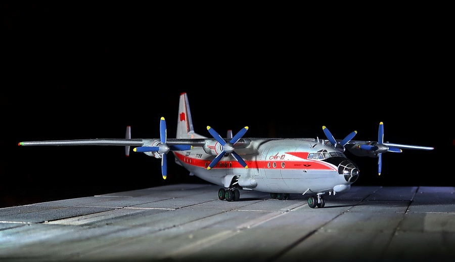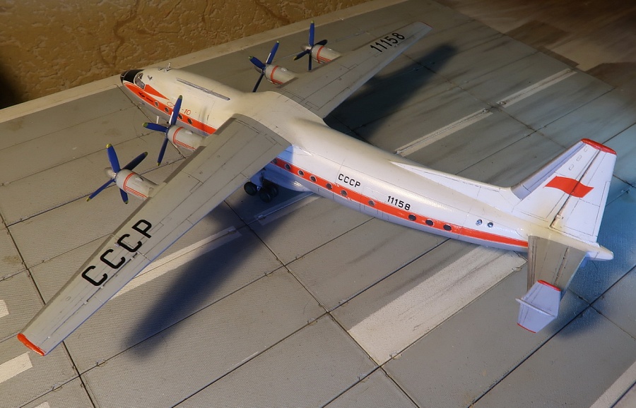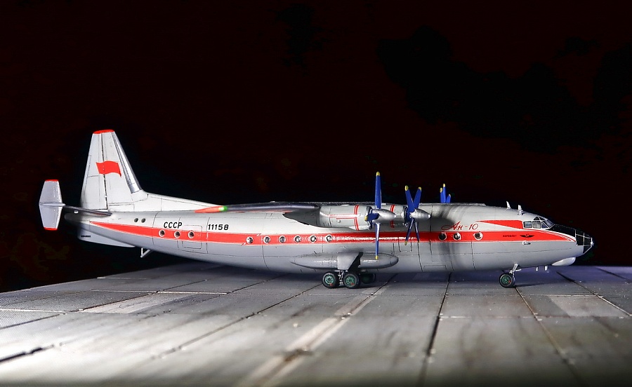 Так что "тявкнул" хорошо, но не в кассу. И меня очень удивило, что ты не обратил внимание на коктейль из двух разных ливрей на этом борту... Загнутый флаг, полосы на движках, стрелка за кабиной - это всё от другого Ан-10, у которого как раз и были плоскости алюминиевого цвета. А у этого должны быть крылышки за фонарём и плотные красные полоски по серебристым движкам вместе с прямым флагом на хвосте.