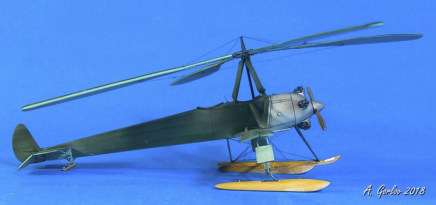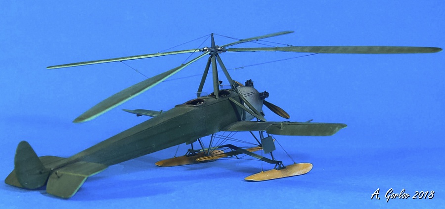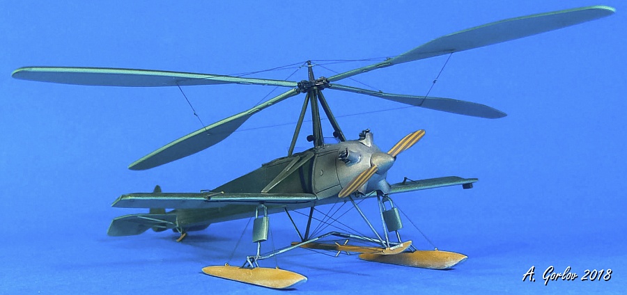 | Приветствую уважаемые коллеги. Вашему вниманию представляется модель советского автожира КАСКР-2 конструкции Камова Николая Ильича и Скржинского Николая Кирилловича. Также бессменным механиком был Крейндлин Эммануил. Крейндлина по-дружески называли Миля. История. 25 сентября дальнейшие полеты КАСКР-1 были временно прекращены для переоборудования машины более мощным двигателем и, соответственно, доведения ее до возможного совершенства. Работа велась до наступления нового, 1931 года. На автожире установили двигатель Гном Рон «Титан» мощностью 225 л. с., снятый с дирижабля. Конструкция аппарата была соответствующим образом усилена и доработана. Для устранения склонности машины разворачиваться и наклоняться в правую сторону с одновременным скольжением влево, угол наклона оси ротора уменьшили до минимального значения, а на законцовку левого крыла поместили свинцовый груз весом 10,3 кг. В новом качестве автожир получил наименование КАСКР‑2. Испытания КАСКР‑2 начались 11 января 1931 г. Практически сразу на нем начал летать новый летчик С. А. Корзинщиков – впоследствии испытавший многие советские опытные автожиры. Более мощный двигатель заметно повысил способности КАСКР‑2 – разбег составлял 20 м течение 5–6 секунд, а максимальная высота, достигнутая 13 января, составила 230 м. В мае 1931 г. полеты на КАСКР‑2 продолжил Кошиц, который отметил, что с повышением температуры окружающего воздуха заметно грелся двигатель. По предложению П. И. Баранова, присутствующего 15 мая 1931 г. при пробных стартах, с воздушного винта сняли кок – обтекатель, а в лобовой части капота прорезали дополнительные отверстия для охлаждения. 21 мая 1931 г. КАСКР‑2 наряду с другими летательными аппаратами советской постройки демонстрировался на Центральном аэродроме правительству во главе с И. В. Сталиным. При осмотре автожира Сталиным, Молотовым и Ворошиловым пояснения давал лично Камов. После осмотра начались показательные полеты. Комендант аэродрома, с тревогой наблюдавший приготовления создателей КАСКР‑2 к старту, в последний момент запретил вылет. Однако Кошиц все‑таки взлетел, набрал высоту триста метров и по периметру три раза облетел весь Центральный аэродром. Затем он круто спланировал и с пробегом всего несколько метров посадил автожир вблизи правительственной делегации. Все присутствующие были в восторге от увиденного, особо отмечалось, что КАСКР-2 произвел хорошее впечатление на Иосифа Сталина. В полете 1 июня КАСКР‑2 достиг высоты 450 м. В этот день на Центральном аэродроме с ним ознакомились представители СОК ЦАГИ во главе с А. М. Черемухиным. 5 июня 1931 г. состоялся последний полет КАСКР‑2, в котором летчик Кошиц осуществил крутое планирование под углом 60° с вертикальной скоростью 7 м/сек. Перед приземлением он выполнил энергичное выравнивание, позволившее уменьшить пробег по земле до 10 м. Дальнейшее совершенствование аппарата признали нерациональным и работы по нему прекратили. Всего КАСКР‑2 выполнил 90 полетов, наибольшая продолжительность одного из них составила 28 минут, максимальная достигнутая высота – 450 м. Основные технические характеристики КАСКР-2 Диаметр несущего винта, м 12.00 Длина, м 9.00 Масса, кг пустого самолета 865 максимальная взлетная 1100 Мощность, л.с. 1 х 225 Максимальная скорость, км/ч 110 Продолжительность полета, ч 0.5 Практический потолок, м 
