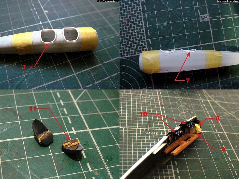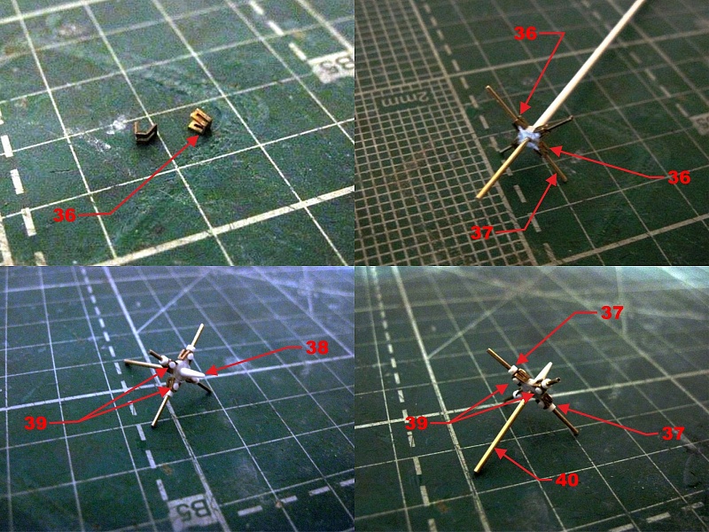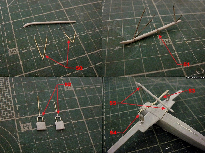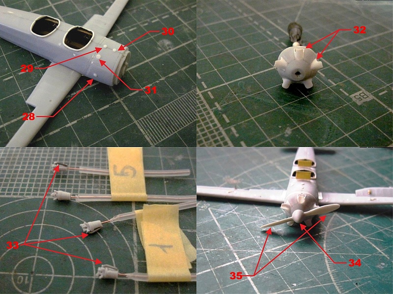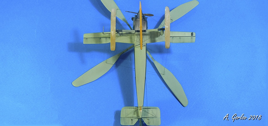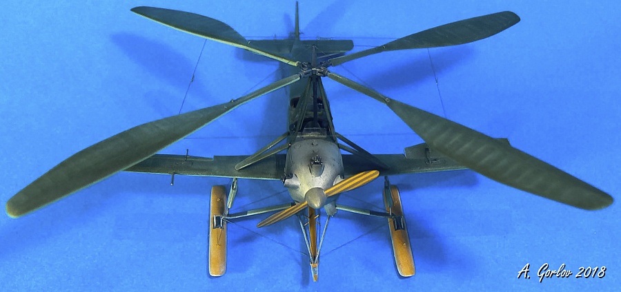 Фюзеляж. 12. Кабанчики поперечного управления с площадкой на отделенных элеронах - набор травления ПМВ; 13. Поворотный механизм на нижней части элеронов - квадратный пруток 0,4 мм; 14. Тех. накладки на крыльях – фольга; 15. Противоскользящие поверхности – фольга; 16. Промежуточные расчалки управления элеронами с осью вращения с проволоки 0,25 мм - набор травления ПМВ; 17. Тяги от промежуточных расчалок управления элеронами - тянутый литник; Сточил стабилизаторы - брёвна до приемлемой толщины. 18. Киперная лента - квадратный пруток 0,4 мм. 19. Кабанчики с основаниями горизонтального управления - набор травления ПМВ; 20. Кабанчики с основаниями путевого управления - набор травления ПМВ; 21. Подкосы стабилизатора – латунная трубка 0,4 мм; 22. Растяжка подкосов – леска; Расчалки рулей высоты и киля путевого управления – чулочная нить; 23. ПВД - латунная трубка; 24. Проводка к ПВД - тянутый литник; 25. Крепление проводки - проволочные петельки д.0.3 мм; 26. Ветровые стёкла - упаковочный материал; 27. Балансировочный груз – смоляной литник. Винтомоторная группа. 28. Заглушки под выхлоп на боковых капотах – пруток 0,7 мм; 29. Заливная горловина бензобака на верхнем капоте – пруток 0,5 мм; 30. Заливная горловина маслобака на верхнем капоте – пруток 0,5 мм; 31. Тех. лючок – пруток 1 мм; Склеил болванку, сзади укрепил пластиком 0,5 мм. Вырубил отверстия под будущие обтекатели и цилиндры; 32. Обтекатели цилиндров – доширакопластик; Из остатков смолы от Мусы Зекореева PROP&JET использовал цилиндры ПД; 33. Выпускные коллекторы - отожжённая проволока; 34. Кок винта - выточил на шуруповёрте; 35. Лопасти тянущего винта с измененным направлением вращения - остатки смолы от Мусы Зекореева PROP&JET. Также на лопастях имитировал фольгой обечайку. Несущая система. Так как втулка из набора представляла из себя просто кусок пластика и одной из изюминок являлась именно она, то было принято решение о глубокой доработке с детализацией по образу КАСКР-1. Сам корпус втулки был взят с набора, 36. Цапфа с горизонтальным шарниром - латунные деталями от ж/д макетирования; 37. Рукава - латунная трубка 0,7 мм и пруток 1,5 мм; 38. Верхний конус - выточен на шуруповёрте; 39. Вертикальные шарниры - пруток 1 мм; 40. Вал - латунная трубка 0,9 мм; 41. Тех. накладки на комлевых частях лопастей – доширакопластик; 42. Петли для растяжек - проволочные петельки д.0.3 мм; 43. Межлопастные расчалки – чулочная нить; 44. Талрепы межлопастных расчалок - скручены с проволоки 0,1 мм на приспособе; 45. Поддерживающие расчалки – чулочная нить; 46. Датчик оборотов - пруток 0,8 мм; 47. Гибкий вал привода тахометра на обтекателе правой стойки передней вилки кабана - латунная трубка 0,3 мм; 48. Тахометр - пруток 1 мм; 49. Зеркало - пруток 1 мм. Взлетно-посадочные устройства. 50. Стойки противокапотной лыжи (пайка) - латунная трубка 0,5 мм; 51. Крестовина противокапотной лыжи - латунные трубки 0,3 мм; 52. Вилка под обтекатель резиношнурового амортизатора основных стоек шасси - латунная трубка 0,5 мм; 53. Поперечная перемычка шасси - сплющенная и выгнутая латунная трубка 1,5 мм; 54. Ось шасси и шток резиношнурового амортизатора - латунная трубка 0,5 мм; 55. Крепёж растяжек - петельки диаметром 0,3 мм; 56. Пирамидальный механизм на лыжах (пайка) - проволока 0,4 мм, сама ось - трубка 0,5 мм; 57. Крепёж растяжек - петельки диаметром 0,3 мм; 58. Пирамидальный механизм хвостовой пяты - проволока 0,4 мм, сама ось - трубка 0,5 мм; 59. Про