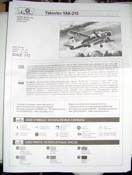 | Всем добрый вечер. Представляю сегодня А-моделовскую новинку – Як-210. Этот самолет был создан в 1953 г. и являлся вариантом созданного тогда же учебного Як-200, предназначался для обучения штурманов. Оснащался двигателями АШ-21. В серию не пошел (как и Як-200) – военные предпочли Ил-28У. Вероятно, сыграл свою роль и закат звезды А.С. Яковлева после смерти Сталина. Пластик производит положительное впечатление. Хорошее как для шорт-рана литье, аккуратный раскрой. Интерьер кабины экипажа упрощенный, да по нему и сведений крайне мало. Вызывает недоумение способ крепления консолей крыла к фюзеляжу, точнее – он вообще отсутствует. А-модел делает и Як-200, пластик там почти тот же. В целом – модель на любителя. Учебные машины вообще не слишком популярная тема, тем более несерийные. Прошу прощения за качество снимков – фотик подвел, переснять нет возможности. Добавил пару снимков качеством получше. |