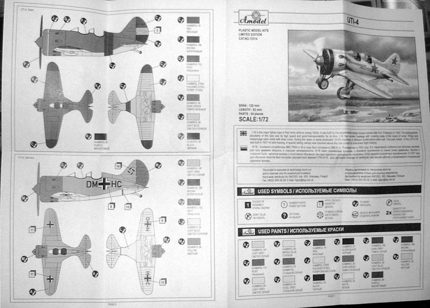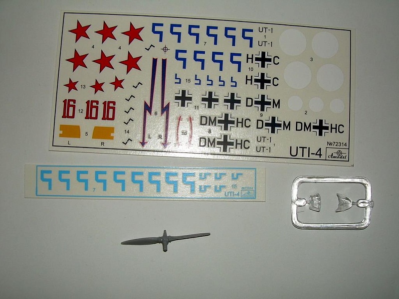 | Всех приветствую. Показываю сегодня обзор на УТИ-4 от А-модела. Это не переиздание старой модели, а новинка.  Качество литья - характерное для позднего А-модела, т.е неплохое. Набор содержит 54 детали.  Прозрачные детали толстые, однако действительно прозрачные. Декаль на 5 вариантов окраски. Цена в Киеве - 260 гривень. | |
