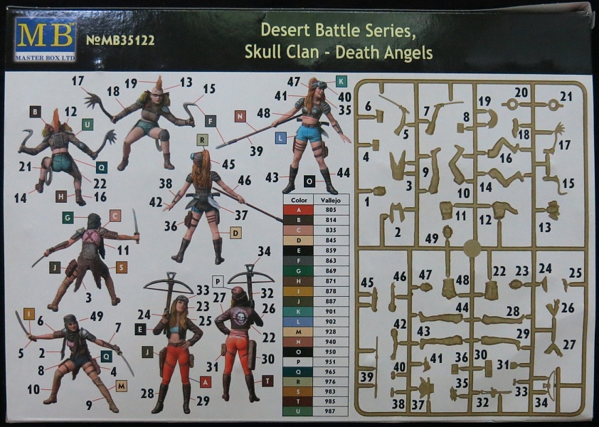 | №MB35122 Серия сделана по мотивам фильмов "Безумный Макс" и подобных, что-то после апокалипсиса. Данный набор содержит "Ангелов смерти" - четыре особы женского пола. Две вполне сойдут за тех кого в подобных фильмах делают положительными героями, третья может и так и так, четвертая безбашенное зло с ирокезом на голове. Но это если следовать стереотипам. Литье в целом хорошее. насколько все хорошо стыкуется покажет сборка.  |
