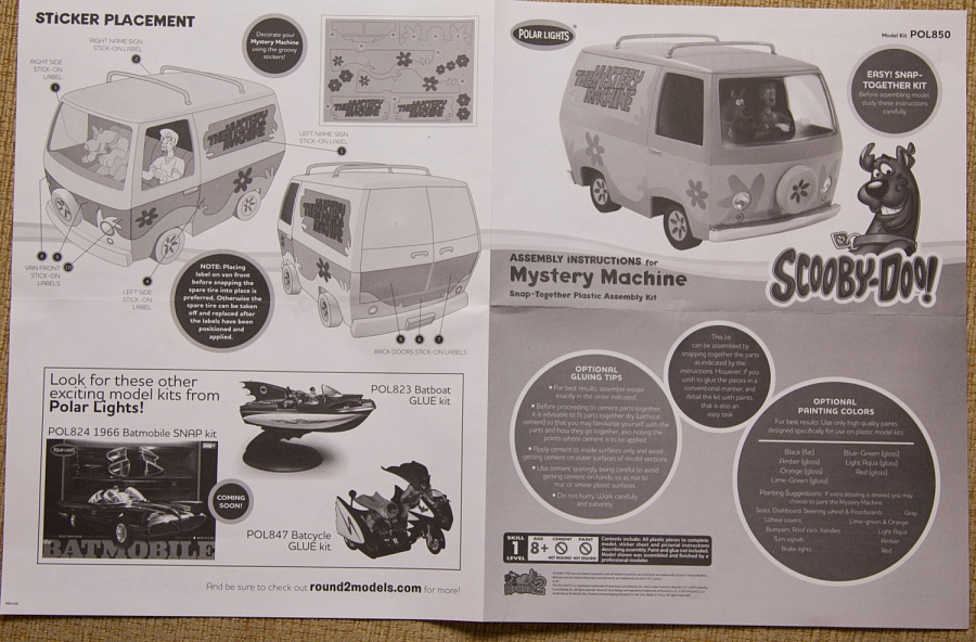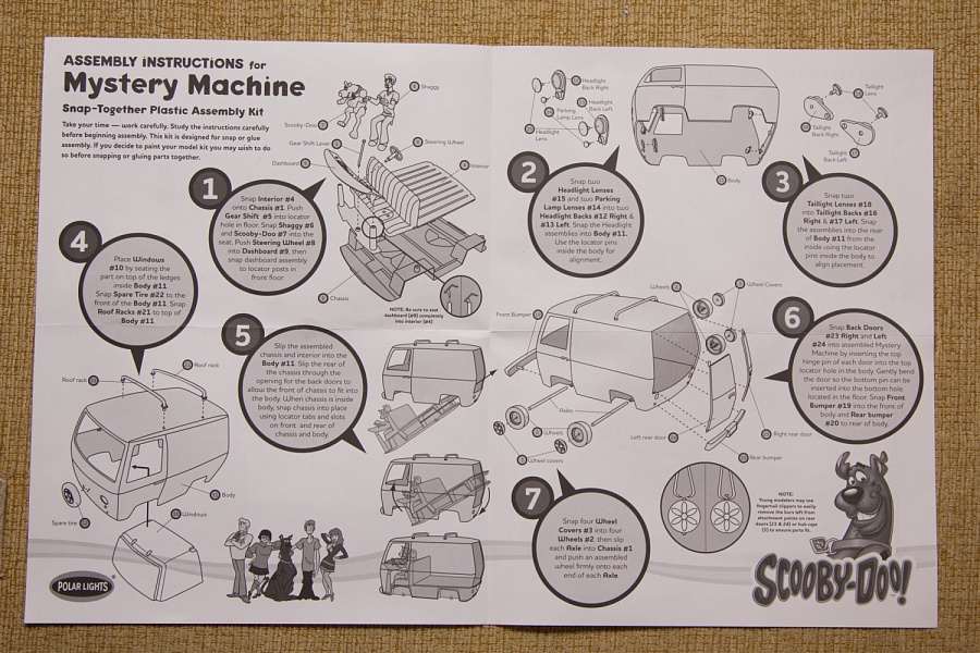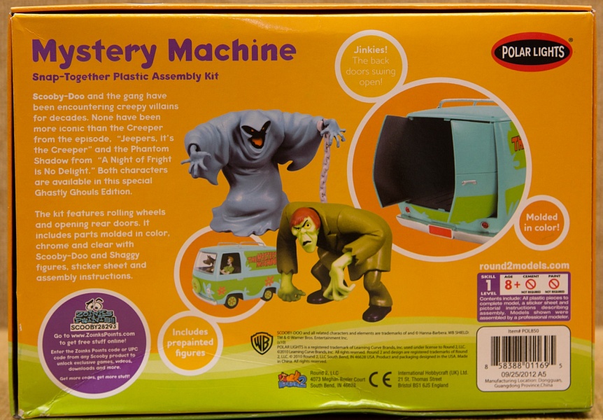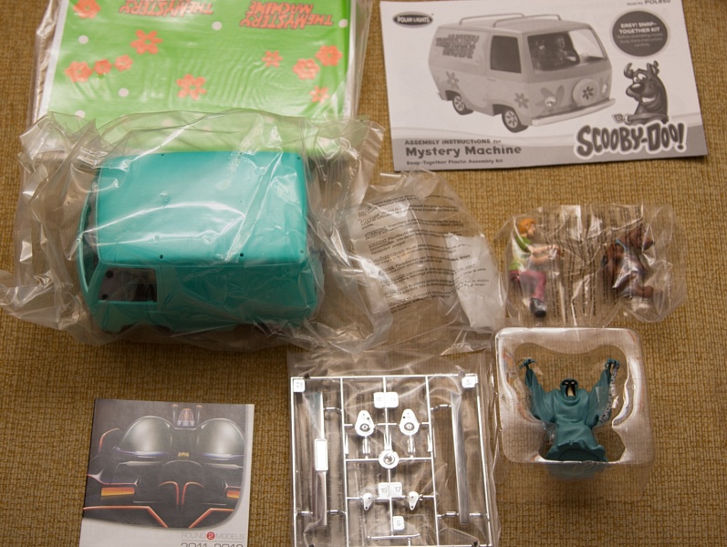 | Модель Таинственного фургончика команды Скуби-ду. Очень простой набор, есть прозрачный литник со стеклом, и литник с хромированными деталями. Цветной пластик хорошего качества, можно собирать без покраски. Комплектуется листом с наклейками (не декаль) для оформления. Также в комплекте идет предварительно окрашенные фигурки Шегги и Скуби и один из монстров. |