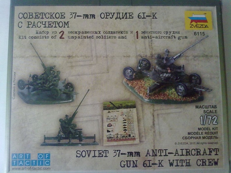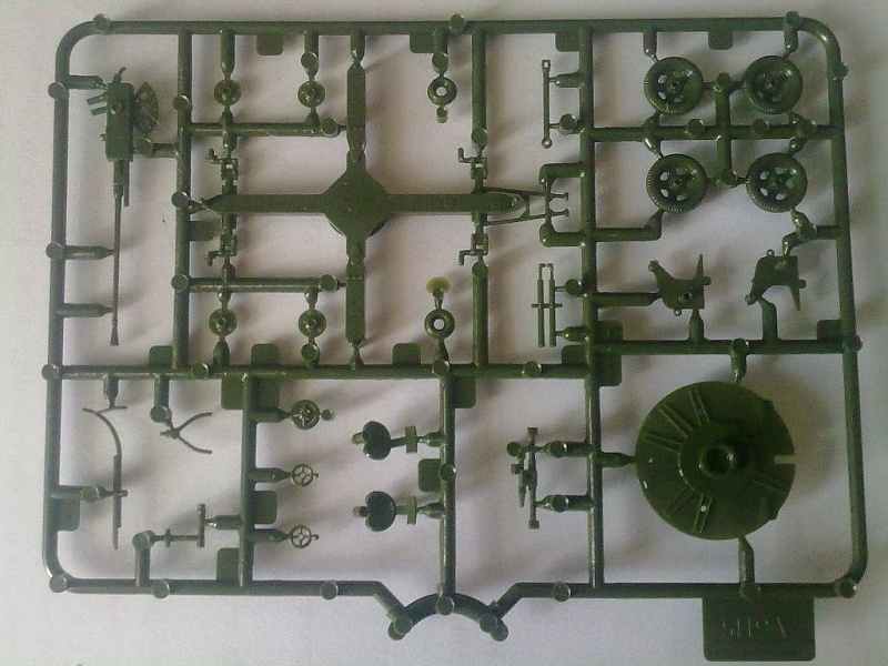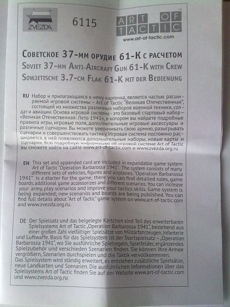 | Набор и прилагаемая к нему карточка, является частью расширяемой игровой системы - Art of Tactic "Великая отечественная". Впрочем на мой взгляд набор неплохой и для создания непосредственно модели нашей 37мм зенитки, либо 40мм бофорса, ибо ствол все равно в таком случае под замену. Есть возможность сборки без клея. Коробка небольших размеров(145х120х20мм), с качественным боксартом, на оборотной стороне фотографии собранной зенитки. Непосредственно в коробочке лежат два литника, инструкция и карточка для настолки. В наборе ~ 36 деталей. Литье качественное, но на некоторых деталях все же присутствует очень небольшое смещение прессформ. Пластик зеленый, жирный. Как клеится обычным модельным клеем я е знаю, но в инструкции такая возможность указана. На первом литнике расположены детали самого зенитного орудия, лафета, прицелов и т.д. На втором расположен расчет, состоящий из двух человек - наводчиков. Заряжающих нет. А так же подставка и флажок для настолки. Инструкция на одном листе А4, схема сборки подробная и понятная. Вариантов сборки два: - Без расчета - С расчетом Собираемость я еще не проверял, но судя по тому, что модель в серии "сборка без клея" проблем возникнуть не должно. Набора в нашем ЦУМе мне обошелся в 90 рублей. P.s. Цифра сдохла, поэтому фотографировал на телефон. |