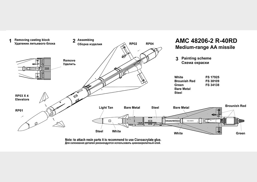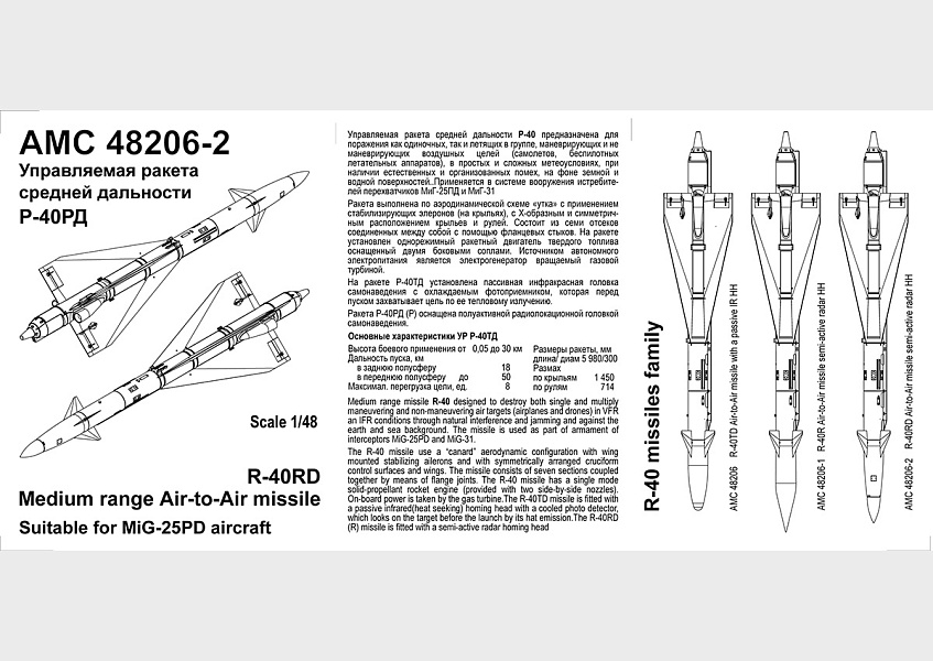 | Приветствую, каропчане! Буквально только что я публиковал обзор на ракету Р-40ТД (http://karopka.ru/community/user/9176/?MODEL=521006) в масштабе 1/48, следом даю обзор еще на одну модификацию этой ракеты. Представляю новый набор вооружения АМС 48206-2 управляемая ракета класса «Воздух-Воздух» Р-40РД. Появление варианта ракеты средней дальности Р-40РД (изделие 46Д), связано с перелетом В. Беленко в Японию в 1976 году. Угнанный МиГ-25П был разобран и изучен японскими и американскими специалистами. Ракет Р-40 на борту не было, но американцы получили достаточно информации о бортовых системах. Была принята программа срочной модернизации комплекса вооружения, предусматривающая, в том числе, замену бортовой РЛС "Смерч-А" на "Сапфир-23" и модернизацию ракетного вооружения. Большим преимуществом новой РЛС семейства "Сапфир-23" (РП-23), ранее предназначавшейся для МиГ-23М, была возможность обнаружения и отслеживания воздушных целей на фоне Земли. С другой стороны, новая станция квазинепрерывного излучения была принципиально несовместима с импульсными "радийными" ракетами Р-40Р. Задача доработки вооружения была решена простейшим образом - на ракетах установили новые ГСН созданные на базе РГС-24 ракет Р-24. Ракета Р-24 входящая в комплекс вооружения самолетов МиГ-23МЛ и МиГ-23П имела существенно меньший диаметр. После адаптации этой ГСН для ракеты Р-40, появился характерный излом обводов головной части, отличительный признак доработанной ракеты. После серии испытаний, постановлением правительства от 30 июня 1979 г, ракета была принята на вооружение и получила обозначение Р-40РД. Вновь выпущенные самолеты именовались МиГ-25ПД, а доработанные в войсках строевые - МиГ-25ПДС. Заканчивая краткий экскурс в историю ракет семейства Р-40, хочется отметить, что ни одна зарубежная ракета не применялась в условиях столь больших скоростей и высот пуска. Немаловажным достижением можно считать и то, что переход на принципиально новый тип ГСН при создании Р-40РД удалось осуществить с минимальными доработками ракеты как летательного аппарата. Теперь непосредственно о наборе вооружения АМС 48206-2. Все как обычно, в фирменной таре поставляются четыре литника с деталями из серой полиуретановой смолы и аккуратная декаль на четыре варианта ракеты. Все, что было сказано в предыдущем обзоре, в полней мере относится и к новому набору вооружения. Фактически они отличаются одним литником и отсутствием прозрачных деталей. Приведенные фотографии прекрасно иллюстрируют все выше сказанное. Лаконичная, но достаточно подробная инструкция дает информацию по сборке, окраске и нанесению декалей. Прекрасный набор для моделей советских перехватчиков МиГ-25ПД . Настоятельно рекомендую! |