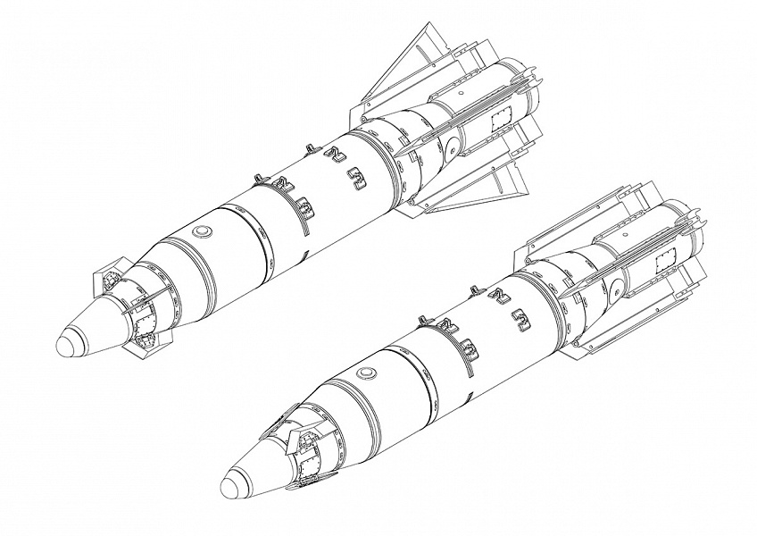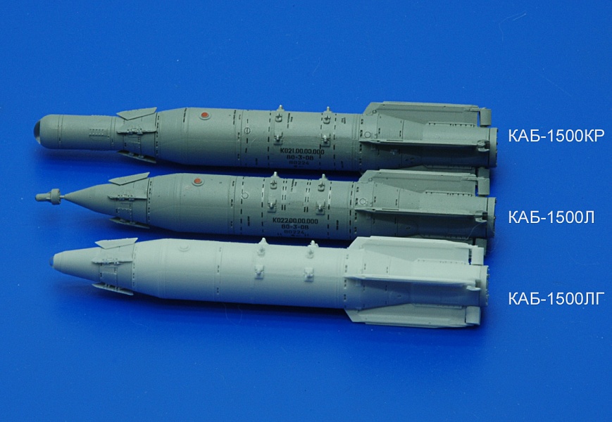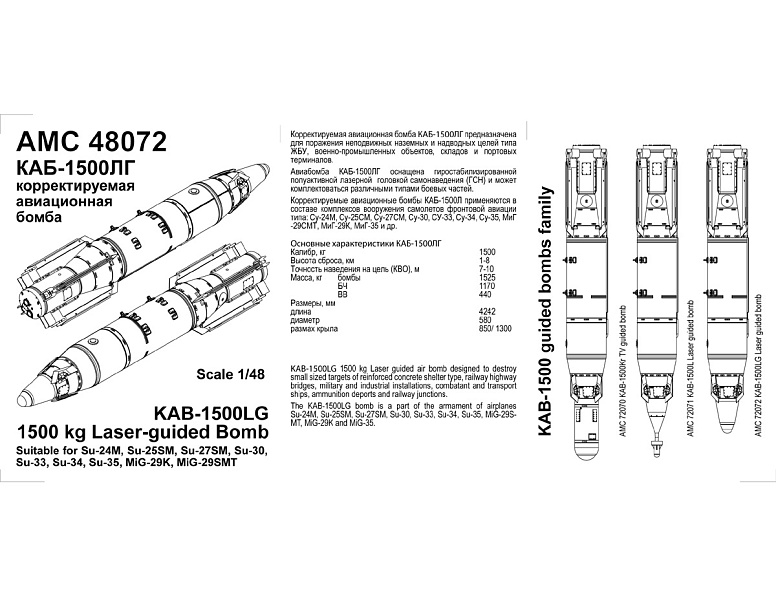 | Приветствую, каропчане! Сегодня я уже выложил обзор на КАБ-500ЛГ 1/48, теперь обзор на набор АМС 48072 корректируемая авиабомба КАБ-1500ЛГ 1/48. Этот набор закрывает линейку корректируемых авиабомб калибра 1500 кг. Итак, КАБ-1500ЛГ. По уже сложившейся традиции, позвольте сказать несколько слов о матчасти. Корректируемая авиационная бомба КАБ-1500ЛГ предназначена для поражения неподвижных наземных и надводных целей типа ЖБУ, военно-промышленных объектов, складов и портовых терминалов. Применяются с самолетов фронтовой авиации типа Су-24М, Су-34, Су-35, и др., оборудованных системой лазерного подсвета цели, а так же носителей, оборудованных простейшими коллиматорными прицелами для выдачи предварительного целеуказания (при использовании наземной подсветки цели) в любое время суток. Конкретные условия применения этих бомб определяются руководством летной эксплуатации самолета-носителя. В отличие от разработанной раньше, КАБ-1500Л с флюгерным приемником отраженного лазерного сигнала, КАБ-1500ЛГ оснащена лазерной гиростабилизированной головкой самонаведения. Это позволило стабилизировать авиабомбу по абсолютному вектору скорости и обеспечить максимальную точность, которая реализуется при использовании преобразователей "излучение - сигнал", устанавливаемых на гиростабилизаторах. Высокая маневренность бомбы обеспечивается балансировочными углами атаки (скольжения), создаваемыми аэродинамическими рулями, при наличии практически нейтральной устойчивости бомбы. В свою очередь, нейтральная устойчивость бомбы определяется выбором геометрических размеров дестабилизаторов, стабилизаторов со стабилизирующими перьями и соответствующим положением центра масс бомбы. Внешне КАБ-1500 поражает, как своими размерами, так и сложностью конструкции. Из конструктивных особенностей, в первую очередь, бросаются в глаза четыре раскрывающихся дестабилизатора в головной части и массивные стабилизаторы с выдвигающимися перьями. Аэродинамические рули, выполнены по биплановой схеме (не я придумал, этот термин взят из технической документации), что позволило получить малые шарнирные моменты рулей. Изделие смотрится весьма брутально. Теперь о наборе. Комплект деталей позволяет собрать две авиабомбы. Детали отлиты из светло-серой полиуретановой смолы и упакованы в стандартную АМовскую тару. Корпус бомбы, подвесные ушки, стабилизаторы отлиты в одну деталь. Отдельными литниками даются, прозрачная линза ГСН, головная часть, дестабилизаторы, задняя шайба и комплект рулей. Подробная инструкция дает информацию по сборке, покраске изделия и нанесению декалей. Хочется отметить разумное технологическое членение, позволяющее проработать основные элементы конструкции и реализовать различные варианты КАБ. Качество литья деталей традиционно высокое. На декали представлена маркировка и серийные номера для нескольких вариантов КАБ-1500. Про деталировку и копийность говорить не нужно. Для этого обзора были предоставлены детальные снимки КАБ-1500ЛГ. У вас есть возможность сравнить реальное изделие и его уменьшенную копию. Выставочные фотографии авиабомбы могут ввести моделистов в заблуждение. Следует помнить, что дестабилизаторы и выдвижные перья всегда, до момента сброса, находятся в сложенном положении. Схема установки дестабилизаторов (направление складывани