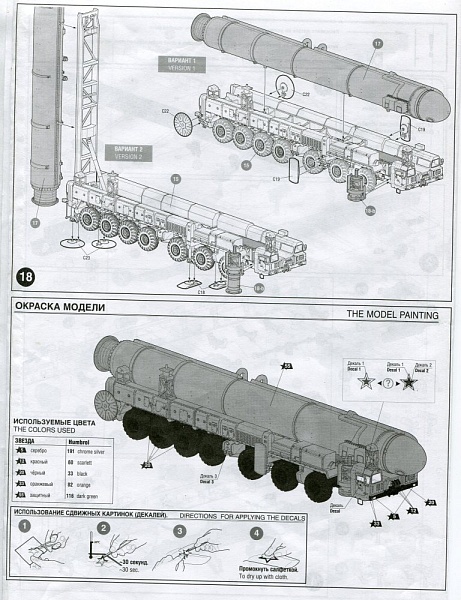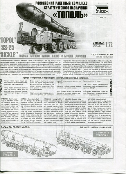 | Новинка то "Звезды" ракетный комплекс "Тополь".... Стандартная звездовская упаковка для быстросборок- глянцевая наружная, с боковой загрузкой и внутренней, из твёрдого картона, с верхней загрузкой.... Коробок приличных размеров 40х24.5х7 см....... На коробке, вместо надписи-"сборка без клея" появилась- "клей в комплекте"....... :-)) На тыльной стороне- варианты собранной модели........ Производитель обещает 309 деталей и размер- 31 см........ В коробке имеем: пять литников (два одинаковых), прозрачный литник, все литники упакованы в пластиковые пакеты, 14 резиноподобных колёс (напомнили ПСТшные, для С-300), декаль со звёздочками и одной техничкой и, самое главное- пузырёк с клеем............... :-)) Все детали без облоя, смещений и прочих "радостей моделиста".... Инструкция- вполне понятная, с чёткой полиграфией........... Дана только одна схема окраски- однотонная, защитная........ :-(( Вроде, по инструкции- сборка без клея, но зачем тогда клей?...... :-)) Думаю, что и чисто изкоробка будет не плохим экспонатом на полке моделистов...... Ну, и, для любителе попилить, есть где разгуляться......... |
