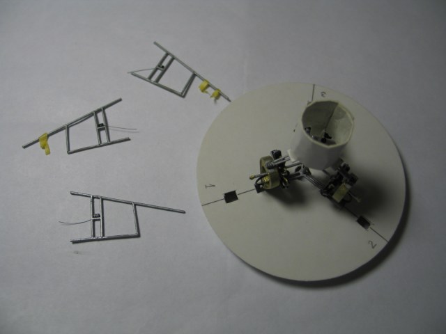 Ладно, раз уж всё равно детали отломались, воспользуемся более удобным доступом: просверлим тончайшие отверстия для расчалок и добавим импровизированные ручки магнето из тянутого литника и электропроводку из мононити.